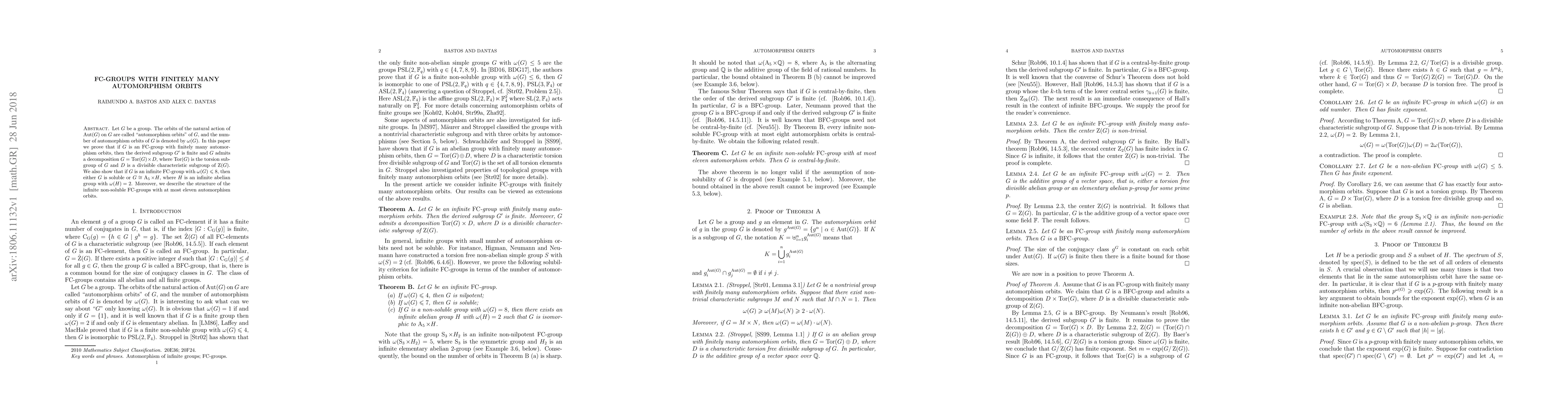 This paper investigates FC-groups with a finite number of automorphism orbits, proving that such groups have a finite derived subgroup and decompose as the product of their torsion subgroup and a divisible characteristic subgroup in the center. Additionally, it classifies infinite FC-groups with up to eleven automorphism orbits, showing they are either soluble or isomorphic to a specific form involving the alternating group $A_5$.