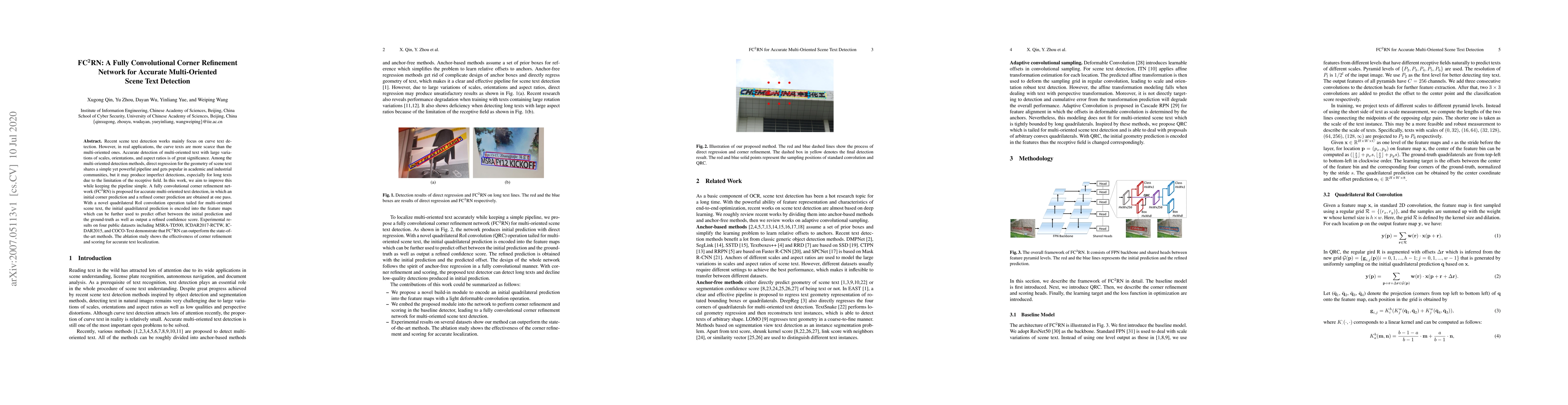 The FC2RN network enhances multi-oriented scene text detection by refining initial corner predictions through a quadrilateral RoI convolution, achieving superior performance over state-of-the-art methods on multiple datasets. The corner refinement and scoring mechanism significantly improve text localization accuracy.