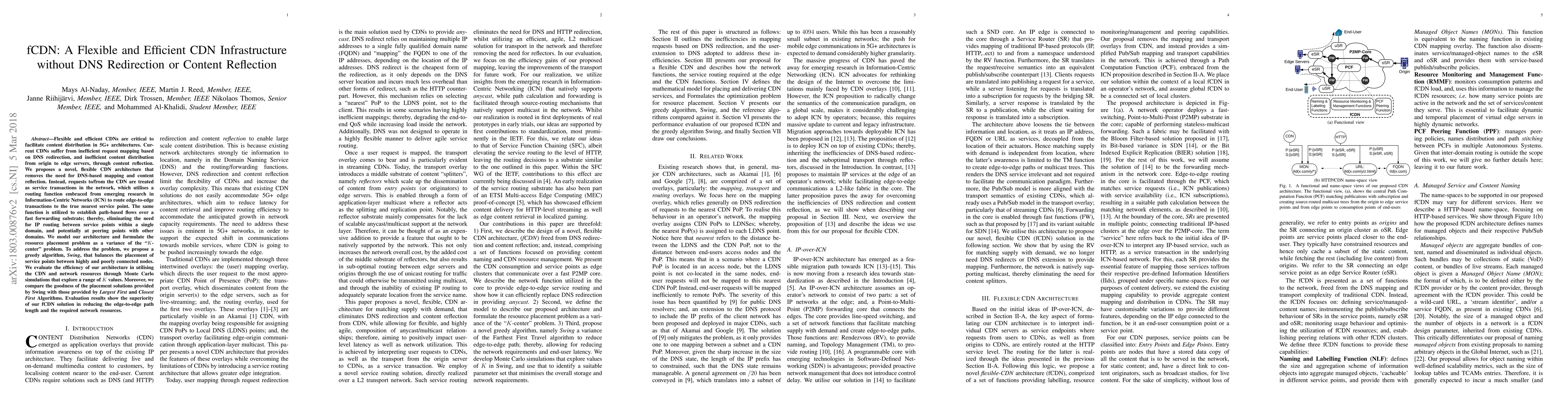 The paper proposes fCDN, a novel CDN architecture that eliminates DNS redirection and content reflection, using service transactions and Information-Centric Networking (ICN) to route requests efficiently. The Swing algorithm optimizes resource placement, outperforming other methods in simulations by reducing path length and resource usage.