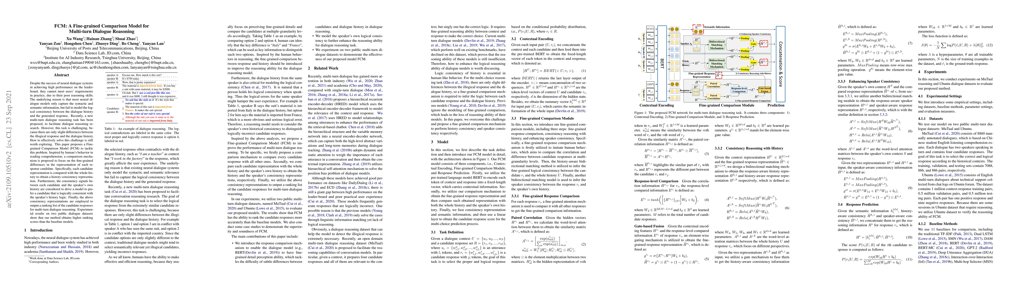 This paper introduces a Fine-grained Comparison Model (FCM) to enhance multi-turn dialogue reasoning by addressing the logical consistency between dialogue history and generated responses. The model employs a comparison mechanism to identify fine-grained differences between candidate responses and the dialogue history, leading to a ranking list of logically consistent responses. Experimental results demonstrate superior performance over baseline models on two public datasets.