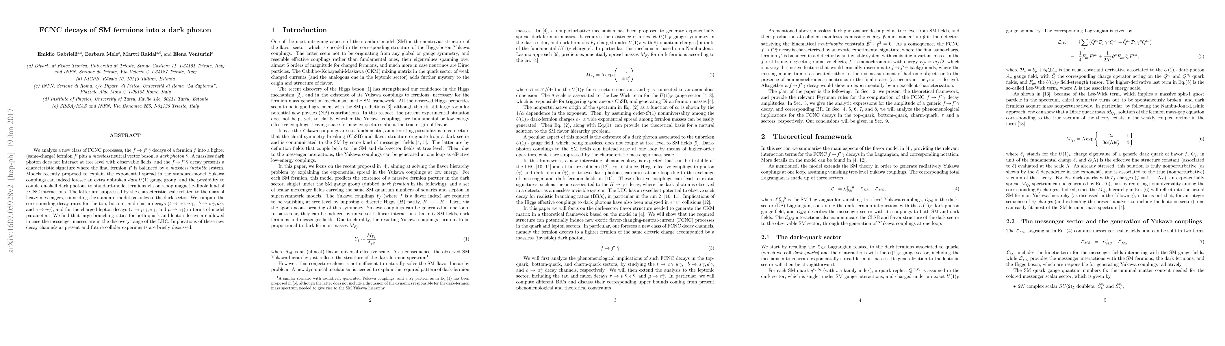 We analyze a new class of FCNC processes, the $f \to f^{\prime} \, \bar{\gamma}$ decays of a fermion $f$ into a lighter (same-charge) fermion $f^{\prime}$ plus a {\it massless} neutral vector boson, a {\it dark photon} $\bar{\gamma}$. A massless dark photon does not interact at tree level with observable fields, and the $f \!\to\! f^{\prime} \, \bar{\gamma}$ decay presents a characteristic signature where the final fermion $f^{\prime}$ is balanced by a {\it massless invisible} system. Models recently proposed to explain the exponential spread in the standard-model Yukawa couplings can indeed foresee an extra unbroken {\it dark} $U(1)$ gauge group, and the possibility to couple on-shell dark photons to standard-model fermions via one-loop magnetic-dipole kind of FCNC interactions. The latter are suppressed by the characteristic scale related to the mass of heavy messengers, connecting the standard model particles to the dark sector. We compute the corresponding decay rates for the top, bottom, and charm decays ($t\to c\, \bar{\gamma},u\, \bar{\gamma}$, $\;b\to s\, \bar{\gamma},d\, \bar{\gamma}$, and $c\to u \bar{\gamma}$), and for the charged-lepton decays ($\tau \to \mu\, \bar{\gamma}, e\, \bar{\gamma}$, and $\mu \to e \bar{\gamma}$) in terms of model parameters. We find that large branching ratios for both quark and lepton decays are allowed in case the messenger masses are in the discovery range of the LHC. Implications of these new decay channels at present and future collider experiments are briefly discussed.