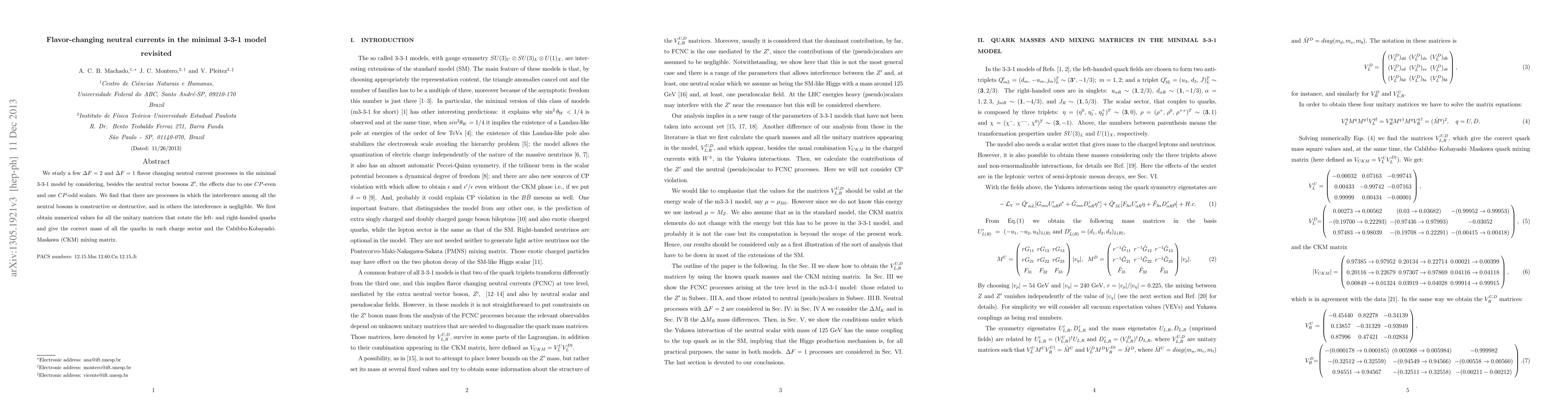 We show that in the minimal 3-3-1 model the flavor changing neutral currents (FCNCs) do not impose necessarily strong constraints on the mass of the $Z^\prime$ of the model if we also consider the neutral scalar contributions to such processes, like the neutral mesons mass difference and rare semileptonic decays. We first obtain numerical values for all the mixing matrices of the model i.e., the unitary matrices that rotate the left- and right-handed quarks in each charge sector which give the correct mass of all the quarks and the CKM mixing matrix. Then, we find that there is a range of parameters in which the neutral scalar contributions to these processes may interfere with those of the $Z^\prime$, implying this vector boson may be lighter than it has been thought.