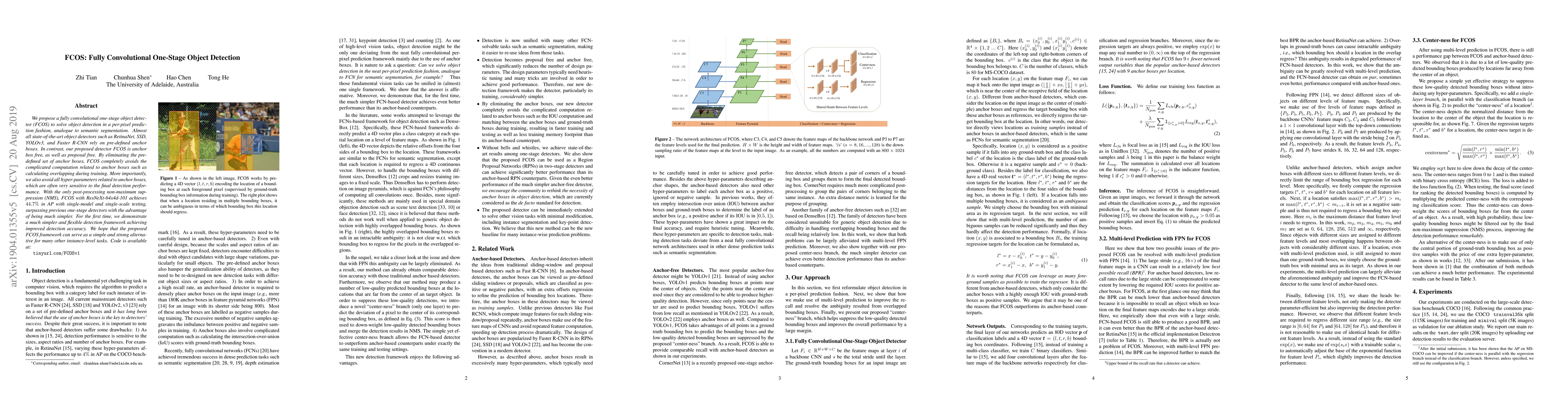 We propose a fully convolutional one-stage object detector (FCOS) to solve object detection in a per-pixel prediction fashion, analogue to semantic segmentation. Almost all state-of-the-art object detectors such as RetinaNet, SSD, YOLOv3, and Faster R-CNN rely on pre-defined anchor boxes. In contrast, our proposed detector FCOS is anchor box free, as well as proposal free. By eliminating the predefined set of anchor boxes, FCOS completely avoids the complicated computation related to anchor boxes such as calculating overlapping during training. More importantly, we also avoid all hyper-parameters related to anchor boxes, which are often very sensitive to the final detection performance. With the only post-processing non-maximum suppression (NMS), FCOS with ResNeXt-64x4d-101 achieves 44.7% in AP with single-model and single-scale testing, surpassing previous one-stage detectors with the advantage of being much simpler. For the first time, we demonstrate a much simpler and flexible detection framework achieving improved detection accuracy. We hope that the proposed FCOS framework can serve as a simple and strong alternative for many other instance-level tasks. Code is available at:Code is available at: https://tinyurl.com/FCOSv1