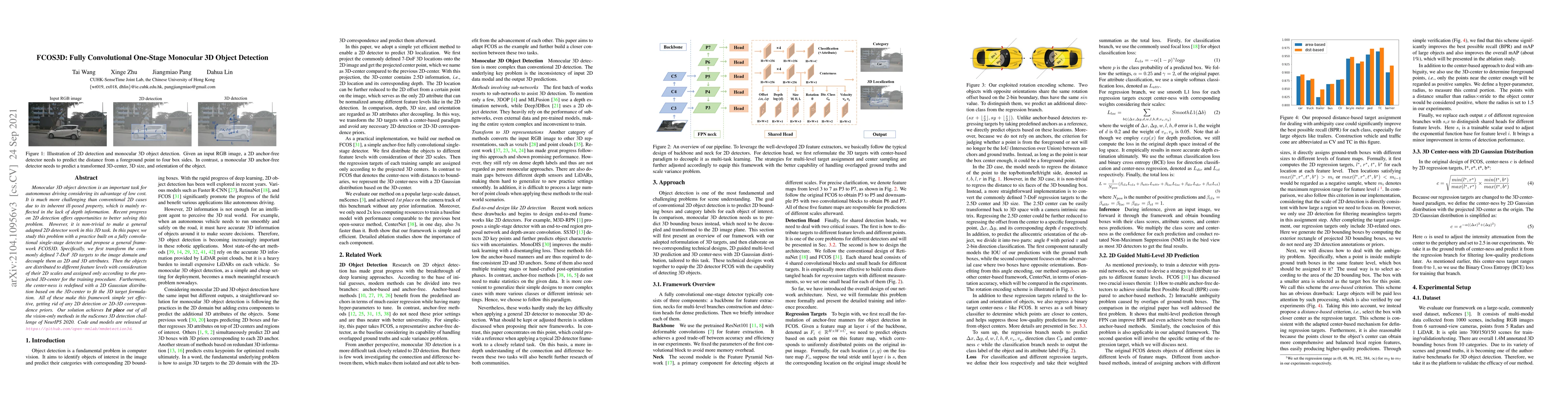 FCOS3D is a fully convolutional one-stage monocular 3D object detection framework that transforms 7-DoF 3D targets into image domain attributes, decoupling them into 2D and 3D components. It achieves top performance in the nuScenes 3D detection challenge without relying on 2D detection or 2D-3D correspondence.