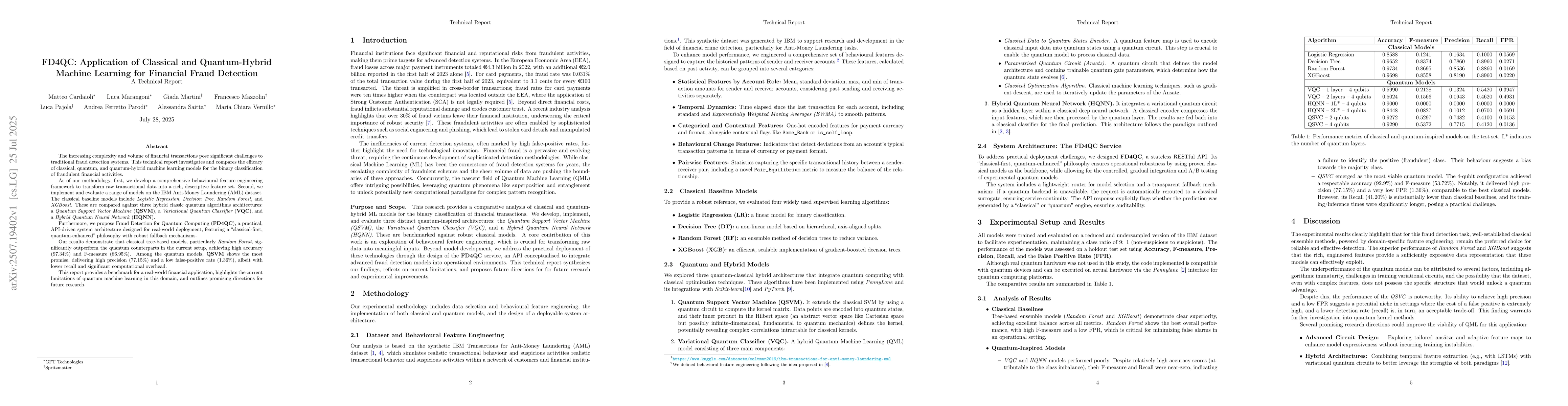 The increasing complexity and volume of financial transactions pose significant challenges to traditional fraud detection systems. This technical report investigates and compares the efficacy of classical, quantum, and quantum-hybrid machine learning models for the binary classification of fraudulent financial activities. As of our methodology, first, we develop a comprehensive behavioural feature engineering framework to transform raw transactional data into a rich, descriptive feature set. Second, we implement and evaluate a range of models on the IBM Anti-Money Laundering (AML) dataset. The classical baseline models include Logistic Regression, Decision Tree, Random Forest, and XGBoost. These are compared against three hybrid classic quantum algorithms architectures: a Quantum Support Vector Machine (QSVM), a Variational Quantum Classifier (VQC), and a Hybrid Quantum Neural Network (HQNN). Furthermore, we propose Fraud Detection for Quantum Computing (FD4QC), a practical, API-driven system architecture designed for real-world deployment, featuring a classical-first, quantum-enhanced philosophy with robust fallback mechanisms. Our results demonstrate that classical tree-based models, particularly \textit{Random Forest}, significantly outperform the quantum counterparts in the current setup, achieving high accuracy (\(97.34\%\)) and F-measure (\(86.95\%\)). Among the quantum models, \textbf{QSVM} shows the most promise, delivering high precision (\(77.15\%\)) and a low false-positive rate (\(1.36\%\)), albeit with lower recall and significant computational overhead. This report provides a benchmark for a real-world financial application, highlights the current limitations of quantum machine learning in this domain, and outlines promising directions for future research.
