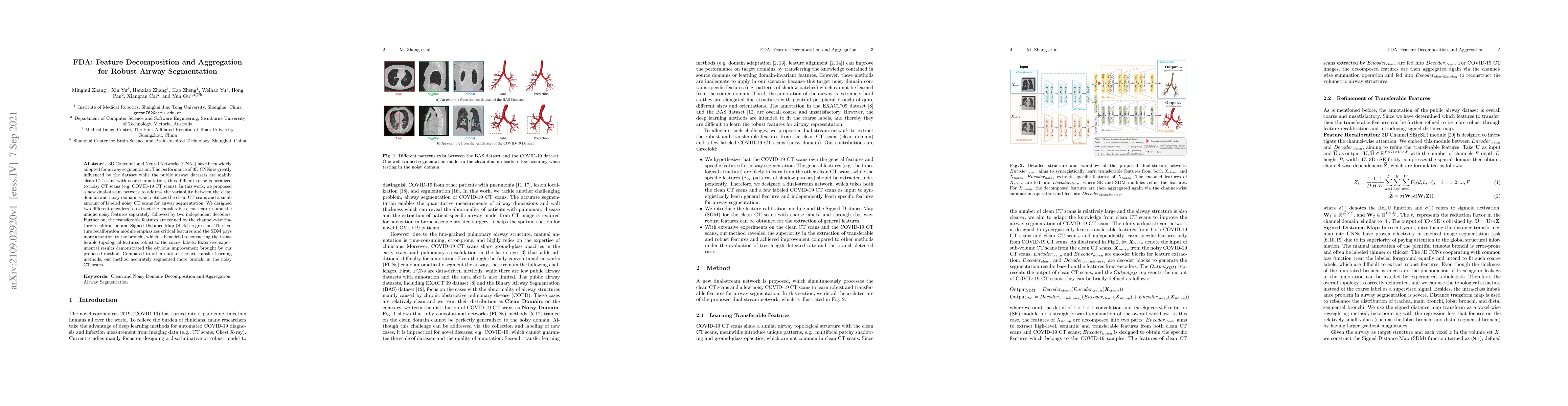 The technical contribution lies in the design of a dual-stream network that decomposes and aggregates features from clean and noisy CT scans, refined by channel-wise feature recalibration and SDM regression, for robust airway segmentation.
