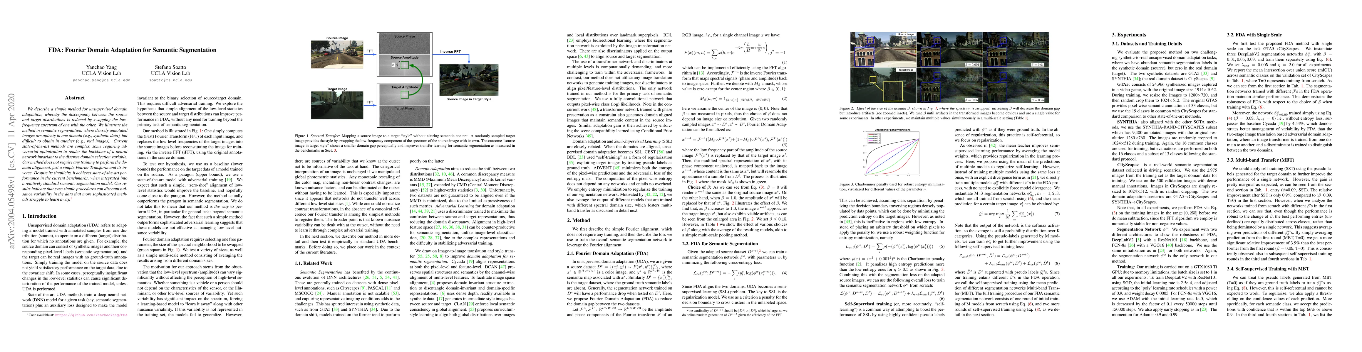 We describe a simple method for unsupervised domain adaptation, whereby the discrepancy between the source and target distributions is reduced by swapping the low-frequency spectrum of one with the other. We illustrate the method in semantic segmentation, where densely annotated images are aplenty in one domain (synthetic data), but difficult to obtain in another (real images). Current state-of-the-art methods are complex, some requiring adversarial optimization to render the backbone of a neural network invariant to the discrete domain selection variable. Our method does not require any training to perform the domain alignment, just a simple Fourier Transform and its inverse. Despite its simplicity, it achieves state-of-the-art performance in the current benchmarks, when integrated into a relatively standard semantic segmentation model. Our results indicate that even simple procedures can discount nuisance variability in the data that more sophisticated methods struggle to learn away.