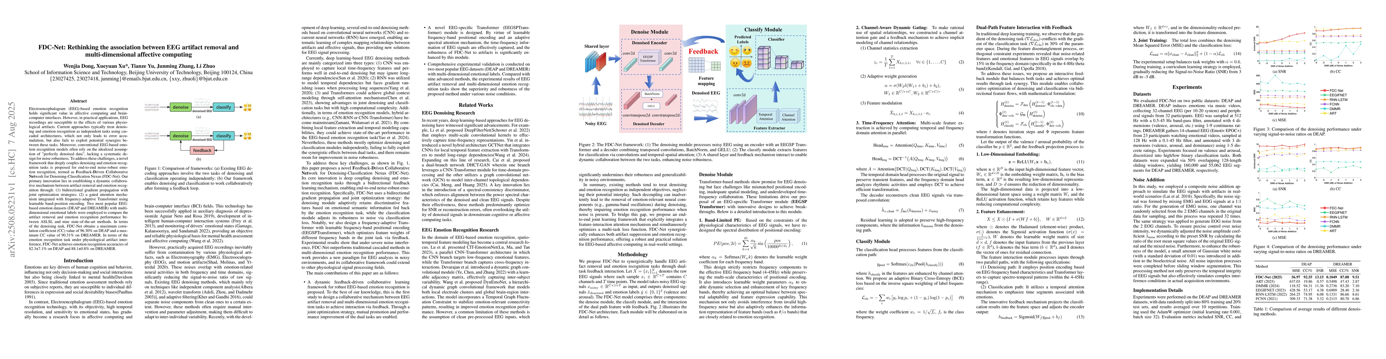 Electroencephalogram (EEG)-based emotion recognition holds significant value in affective computing and brain-computer interfaces. However, in practical applications, EEG recordings are susceptible to the effects of various physiological artifacts. Current approaches typically treat denoising and emotion recognition as independent tasks using cascaded architectures, which not only leads to error accumulation, but also fails to exploit potential synergies between these tasks. Moreover, conventional EEG-based emotion recognition models often rely on the idealized assumption of "perfectly denoised data", lacking a systematic design for noise robustness. To address these challenges, a novel framework that deeply couples denoising and emotion recognition tasks is proposed for end-to-end noise-robust emotion recognition, termed as Feedback-Driven Collaborative Network for Denoising-Classification Nexus (FDC-Net). Our primary innovation lies in establishing a dynamic collaborative mechanism between artifact removal and emotion recognition through: (1) bidirectional gradient propagation with joint optimization strategies; (2) a gated attention mechanism integrated with frequency-adaptive Transformer using learnable band-position encoding. Two most popular EEG-based emotion datasets (DEAP and DREAMER) with multi-dimensional emotional labels were employed to compare the artifact removal and emotion recognition performance between ASLSL and nine state-of-the-art methods. In terms of the denoising task, FDC-Net obtains a maximum correlation coefficient (CC) value of 96.30% on DEAP and a maximum CC value of 90.31% on DREAMER. In terms of the emotion recognition task under physiological artifact interference, FDC-Net achieves emotion recognition accuracies of 82.3+7.1% on DEAP and 88.1+0.8% on DREAMER.