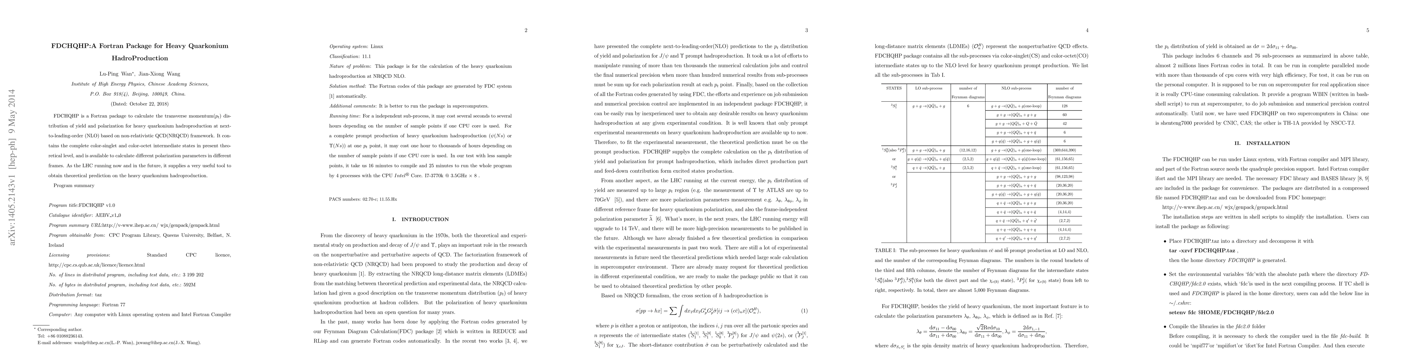 FDCHQHP is a Fortran package to calculate the transverse momentum (p_t) distribution of yield and polarization for heavy quarkonium hadroproduction at next-to-leading-order (NLO) based on non-relativistic QCD(NRQCD) framework. It contains the complete color-singlet and color-octet intermediate states in present theoretical level, and is available to calculate different polarization parameters in different frames. As the LHC running now and in the future, it supplies a very useful tool to obtain theoretical prediction on the heavy quarkonium hadroproduction.