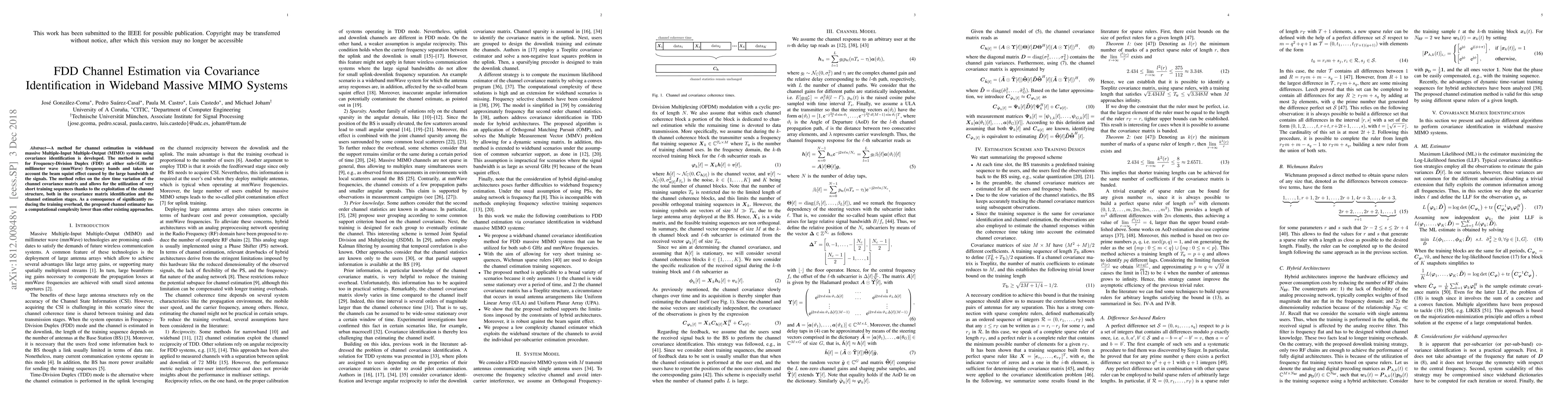 This paper proposes a covariance identification method for channel estimation in wideband massive MIMO systems, particularly for FDD at sub-6GHz or mmWave bands, addressing beam squint effects. It leverages the slow time variation of the channel covariance matrix to reduce training overhead and computational complexity.