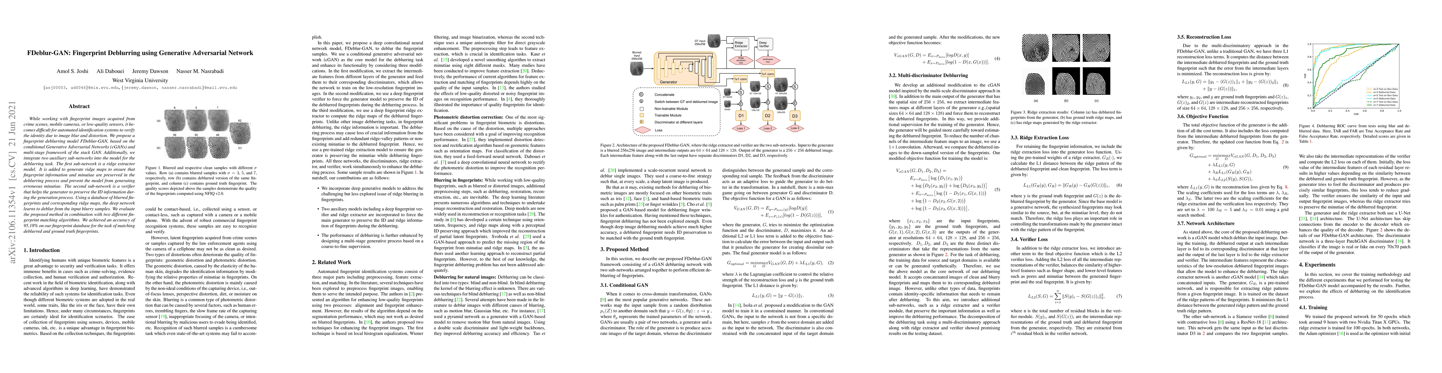FDeblur-GAN, a fingerprint deblurring model based on conditional GANs and a stack GAN framework, incorporates ridge extractor and verifier sub-networks to preserve minutiae and ID information. The method achieved 95.18% accuracy in matching deblurred fingerprints with ground truth.