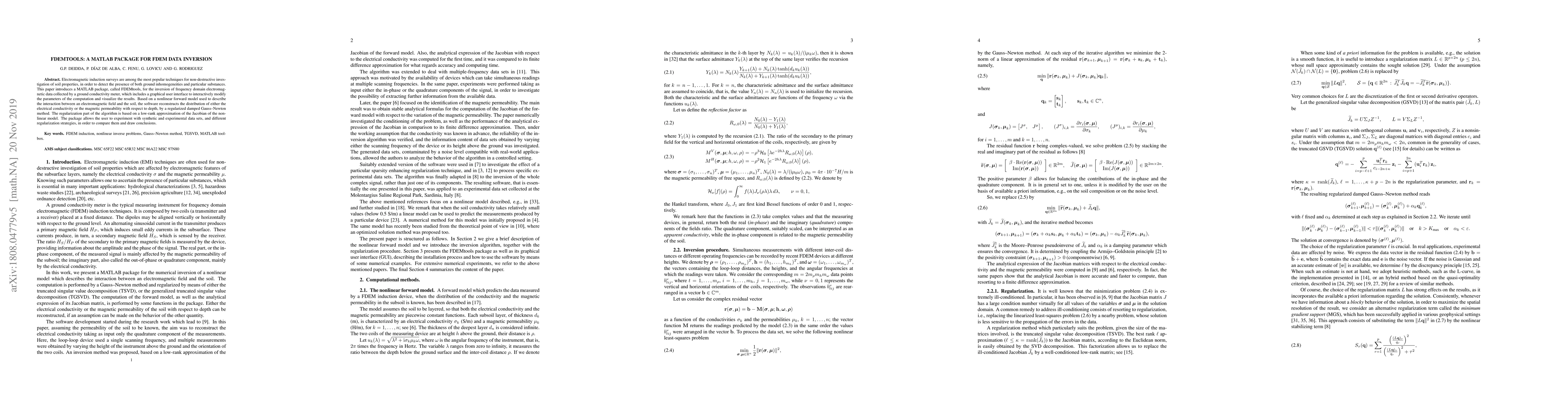 A new MATLAB package called FDEMtools is introduced to invert electromagnetic data, allowing for non-destructive soil property investigation. The software uses a nonlinear forward model to reconstruct electrical conductivity or magnetic permeability with depth.