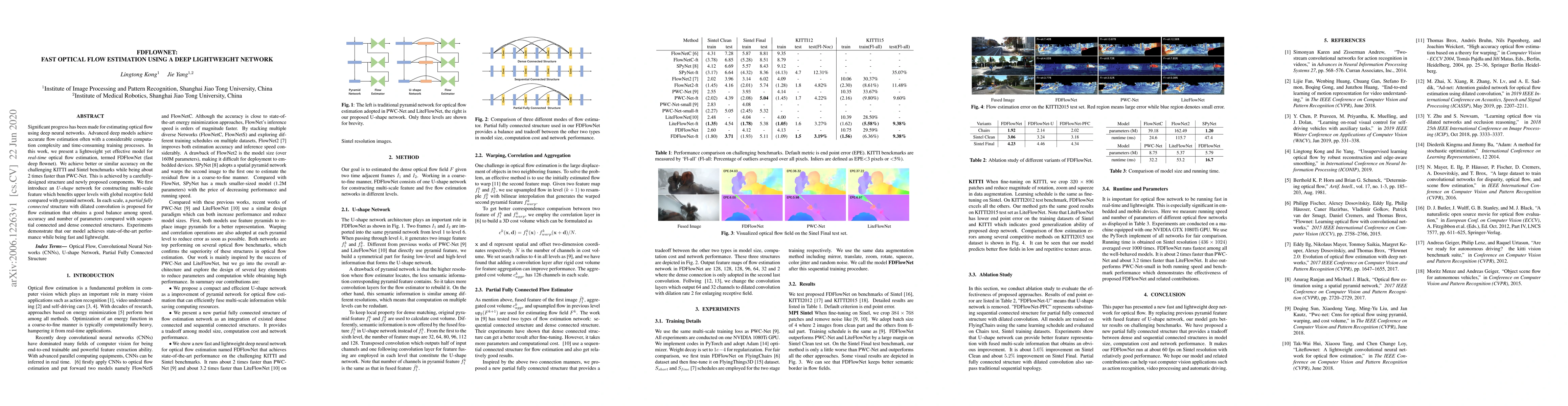 FDFlowNet presents a lightweight deep network for real-time optical flow estimation, achieving comparable accuracy to advanced models while being twice as fast. The model employs a U-shape network and a partial fully connected structure with dilated convolutions, optimizing speed, accuracy, and parameter efficiency.