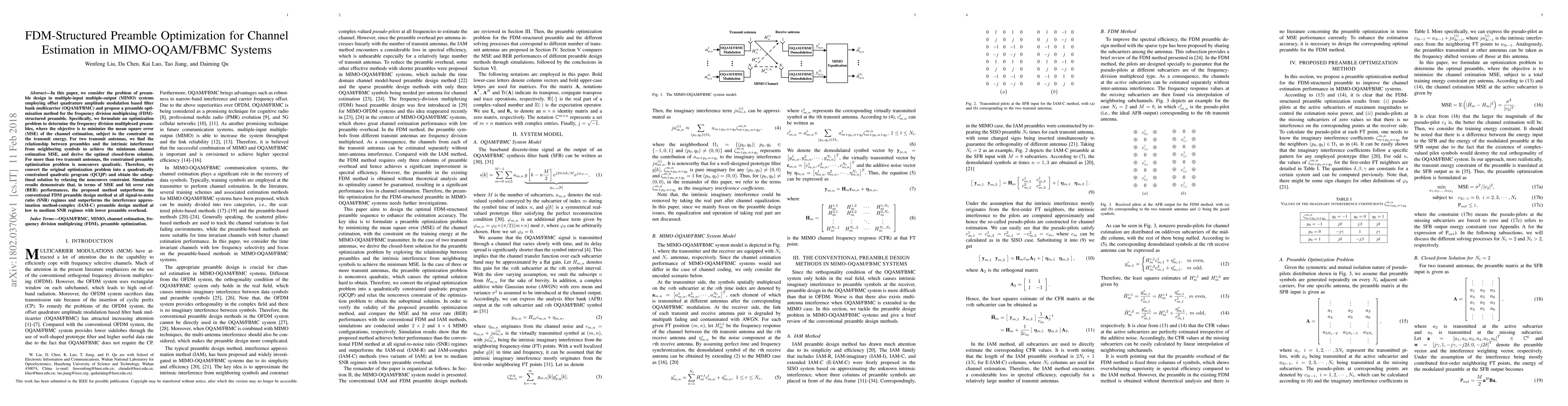 This paper proposes an optimization method for FDM-structured preambles in MIMO OQAM/FBMC systems to minimize channel estimation mean square error (MSE). For two antennas, it derives an optimal closed-form solution, while for more antennas, it converts the nonconvex problem into a QCQP and obtains a suboptimal solution, demonstrating superior performance over conventional and interference approximation methods in simulations.
