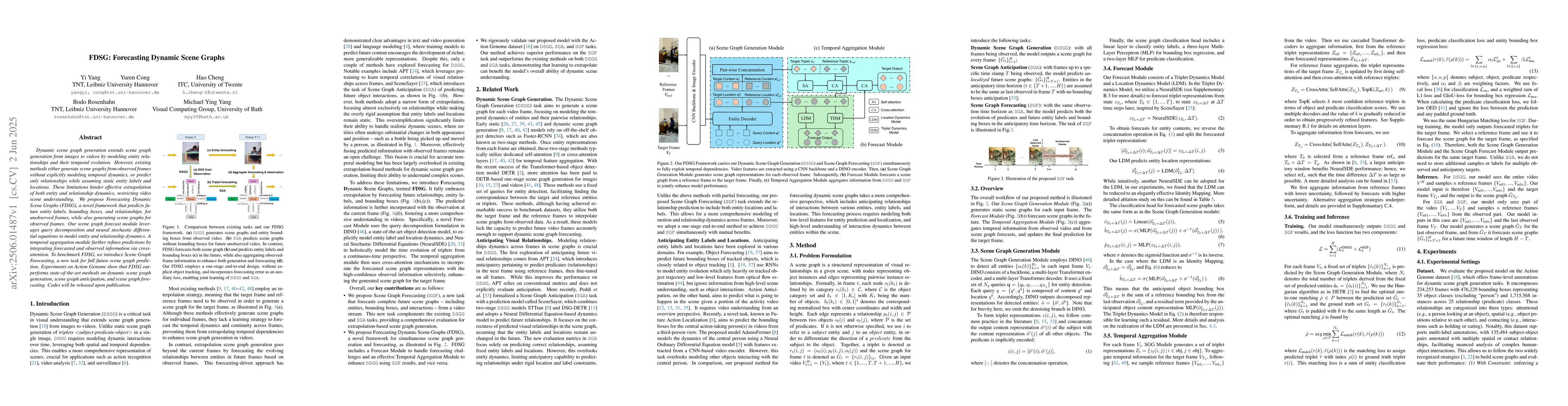 FDSG distinguishes itself by simultaneously predicting entity labels, bounding boxes, and relationships for unobserved frames, modeling temporal dynamics explicitly, and refining predictions through a temporal aggregation module.