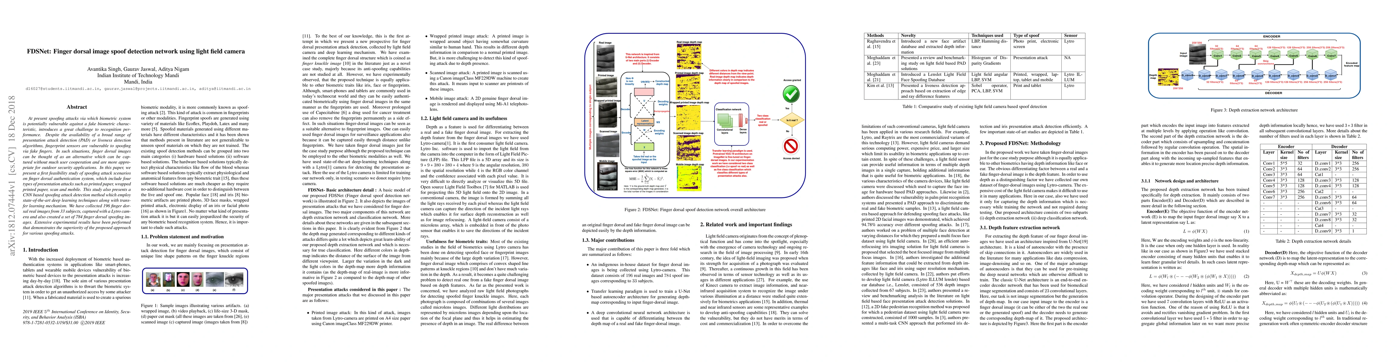 This paper introduces FDSNet, a convolutional neural network for detecting spoofing attacks on finger dorsal image-based authentication using light field cameras. The study evaluates four types of presentation attacks and demonstrates the effectiveness of the proposed method through extensive experiments on a dataset of real and spoofing finger dorsal images.