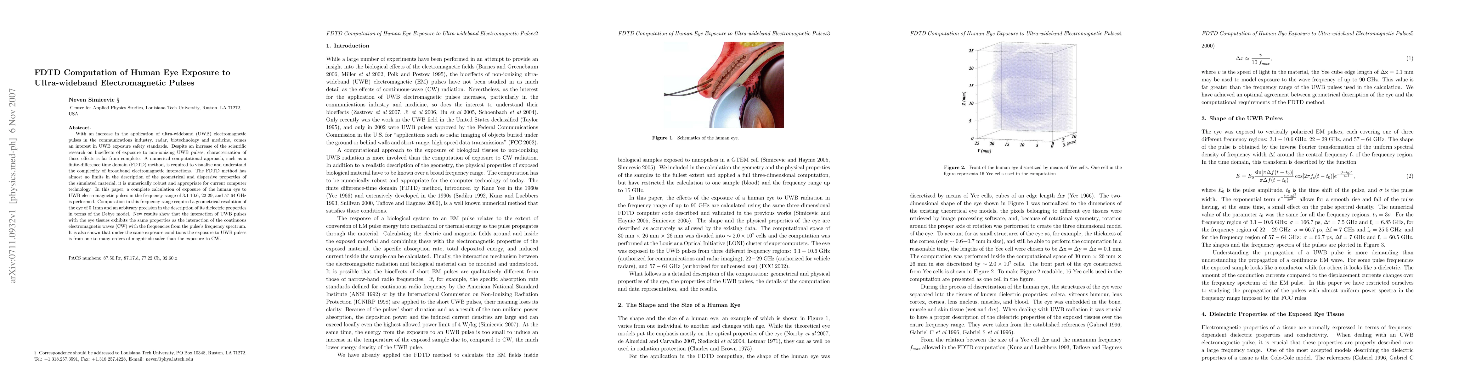 This paper uses FDTD computation to analyze human eye exposure to ultra-wideband (UWB) electromagnetic pulses across various frequency ranges, demonstrating that UWB exposure is significantly safer than continuous wave (CW) exposure due to its broadband nature. The study highlights the robustness of the FDTD method for detailed electromagnetic interaction analysis.