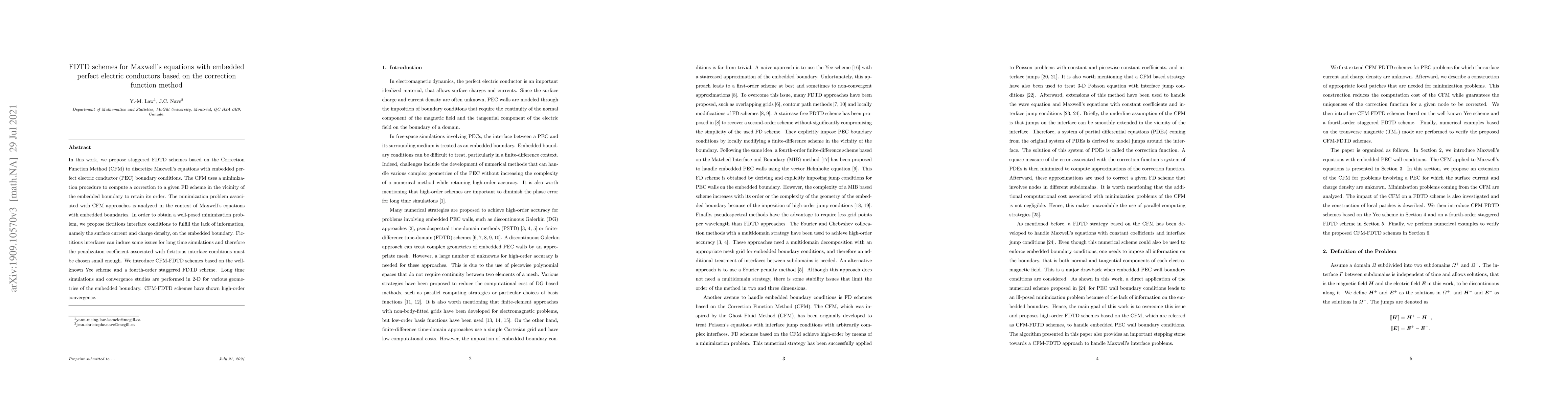 In this work, we propose staggered FDTD schemes based on the correction function method (CFM) to discretize Maxwell's equations with embedded perfect electric conductor (PEC) boundary conditions. The CFM uses a minimization procedure to compute a correction to a given FD scheme in the vicinity of the embedded boundary to retain its order. The minimization problem associated with CFM approaches is analyzed in the context of Maxwell's equations with embedded boundaries. In order to obtain a well-posed problem, we propose fictitious interface conditions to fulfill the lack of information, namely the surface current and charge density, on the embedded boundary. Fictitious interfaces can induce some issues for long time simulations and therefore the penalization coefficient associated with fictitious interface conditions must be chosen small enough. We introduce CFM-FDTD schemes based on the well-known Yee scheme and a fourth-order staggered FDTD scheme. Long time simulations and convergence studies are performed in 2-D for various geometries of the embedded boundary. CFM-FDTD schemes have shown high-order convergence.