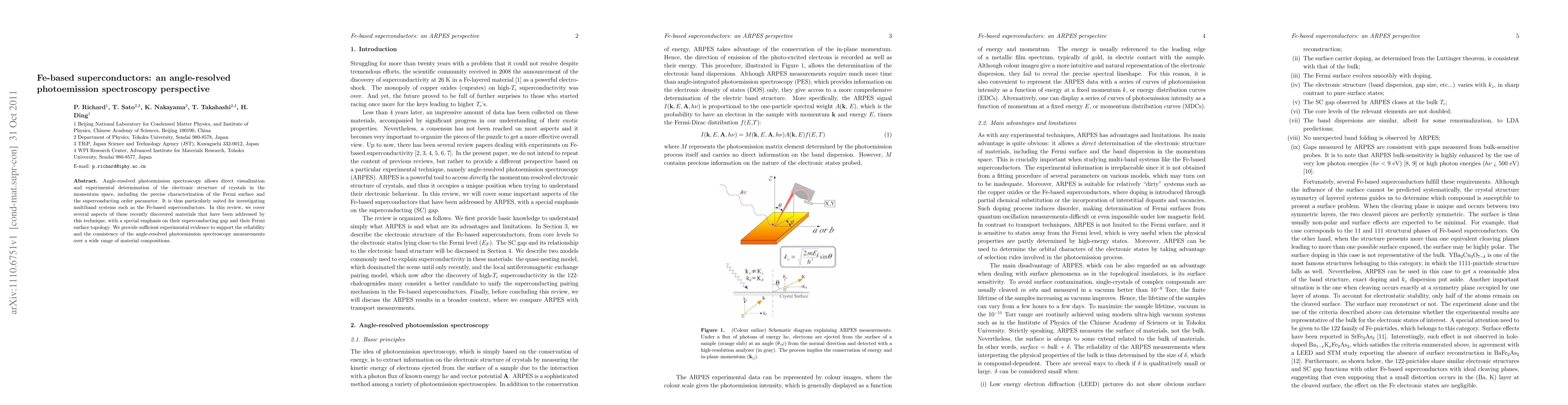 This paper reviews the application of angle-resolved photoemission spectroscopy to study Fe-based superconductors, focusing on their electronic structure, superconducting gap, and Fermi surface topology, providing experimental evidence for the technique's reliability.