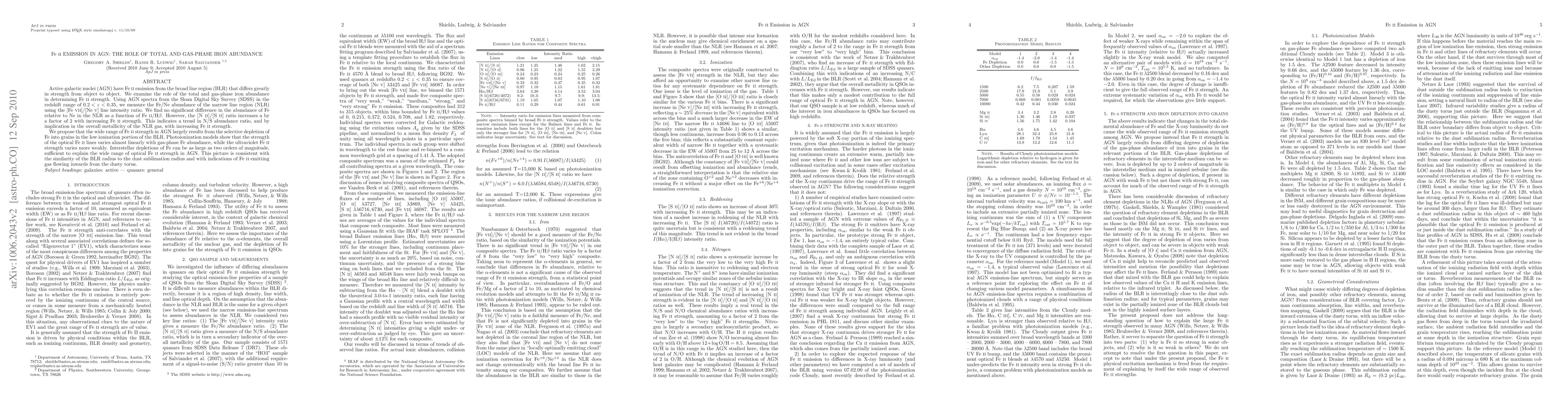 Active galactic nuclei (AGN) have Fe II emission from the broad line region (BLR) that differs greatly in strength from object to object. We examine the role of the total and gas-phase iron abundance in determining Fe II strength. Using AGN spectra from the Sloan Digital Sky Survey (SDSS) in the redshift range of 0.2 < z < 0.35, we measure the Fe/Ne abundance of the narrow line region (NLR) using the [Fe VII]/[Ne V] line intensity ratio. We find no significant difference in the abundance of Fe relative to Ne in the NLR as a function of Fe II/Hbeta. However, the N II/S II ratio increases a by a factor of 2 with increasing Fe II strength. This indicates a trend in N/S abundance ratio, and by implication in the overall metallicity of the NLR gas, with increasing Fe II strength. We propose that the wide range of Fe II strength in AGN largely results from the selective depletion of Fe into grains in the low ionization portion of the BLR. Photoionization models show that the strength of the optical Fe II lines varies almost linearly with gas-phase Fe abundance, while the ultraviolet Fe II strength varies more weakly. Interstellar depletion of Fe can be as large as two orders of magnitude, sufficient to explain the wide range of optical Fe II strength in AGN. This picture is consistent with the similarity of the BLR radius to the dust sublimation radius and with indications of Fe II emitting gas flowing inwards from the dusty torus.