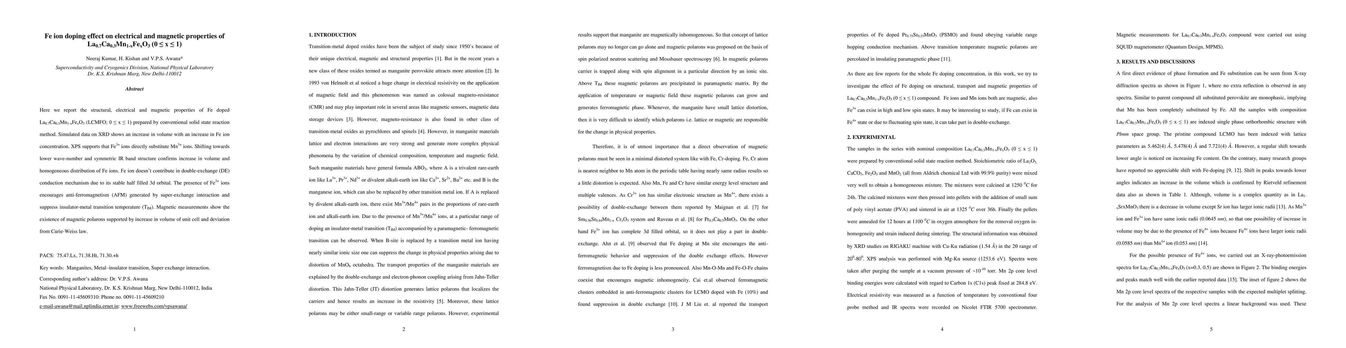 Researchers explored the effects of Fe doping on La0.7Ca0.3Mn1-xFexO3, a compound with unique electrical and magnetic properties. The study found that increasing Fe ion concentration leads to an increase in volume, anti-ferromagnetism, and suppression of insulator-metal transition temperature.