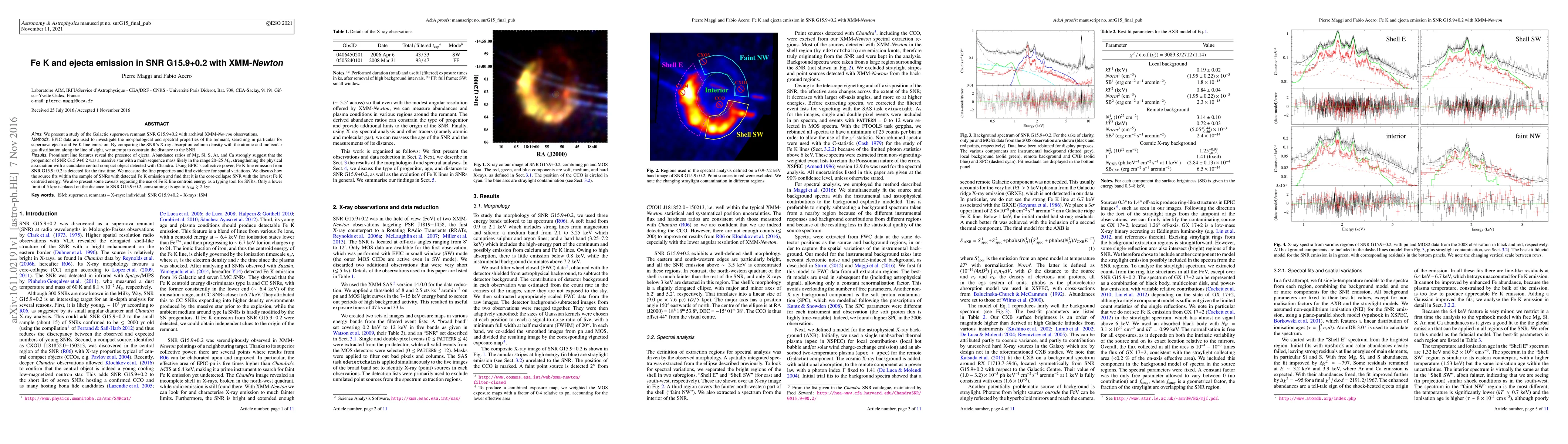 Aims: We present a study of the Galactic supernova remnant SNR G15.9+0.2 with archival XMM-Newton observations. Methods: EPIC data are used to investigate the morphological and spectral properties of the remnant, searching in particular for supernova ejecta and Fe K line emission. By comparing the SNR's X-ray absorption column density with the atomic and molecular gas distribution along the line of sight, we attempt to constrain the distance to the SNR. Results: Prominent line features reveal the presence of ejecta. Abundance ratios of Mg, Si, S, Ar, and Ca strongly suggest that the progenitor of SNR G15.9+0.2 was a massive star with a main sequence mass likely in the range 20-25 $M_{\odot}$, strengthening the physical association with a candidate central compact object detected with Chandra. Using EPIC's collective power, Fe K line emission from SNR G15.9+0.2 is detected for the first time. We measure the line properties and find evidence for spatial variations. We discuss how the source fits within the sample of SNRs with detected Fe K emission and find that it is the core-collapse SNR with the lowest Fe K centroid energy. We also present some caveats regarding the use of Fe K line centroid energy as a typing tool for SNRs. Only a lower limit of 5 kpc is placed on the distance to SNR G15.9+0.2, constraining its age to $t_{SNR} \gtrsim 2$ kyr.