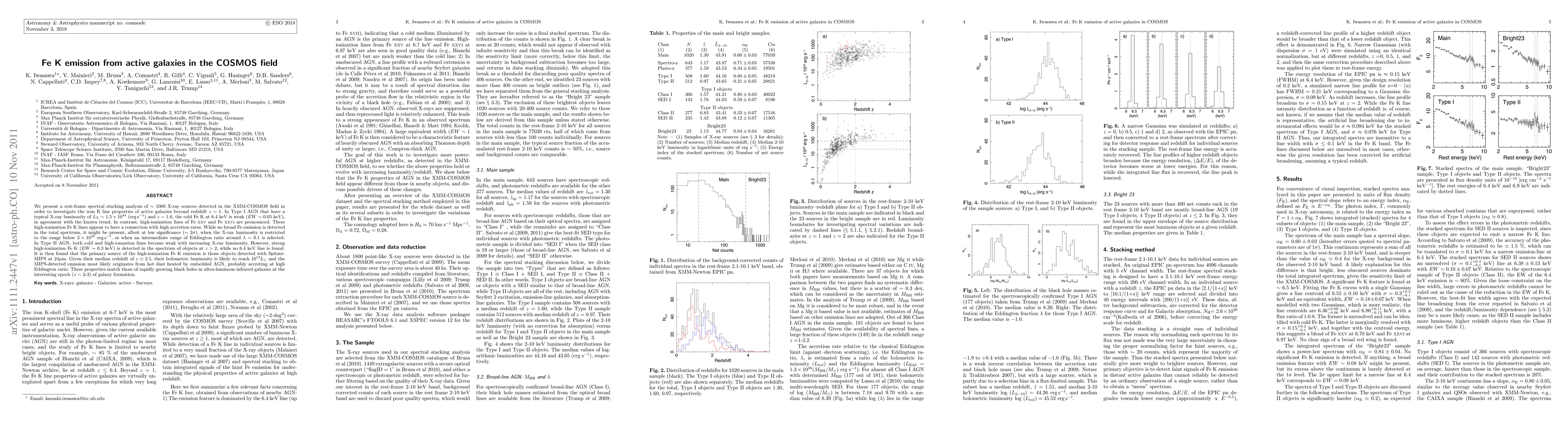 We present a rest-frame spectral stacking analysis of ~1000 X-ray sources detected in the XMM-COSMOS field in order to investigate the iron K line properties of active galaxies beyond redshift z~1. In Type I AGN that have a typical X-ray luminosity of Lx~1.5e44 erg/s and z~1.6, the cold Fe K at 6.4 keV is weak (EW~0.05keV), in agreement with the known trend. In contrast, high-ionization lines of Fe XXV and Fe XXVI are pronounced. These high-ionization Fe K lines appear to have a connection with high accretion rates. While no broad Fe emission is detected in the total spectrum, it might be present, albeit at low significance, when the X-ray luminosity is restricted to the range below 3e44 erg/s, or when an intermediate range of Eddington ratio around 0.1 is selected. In Type II AGN, both cold and high-ionzation lines become weak with increasing X-ray luminosity. However, strong high-ionization Fe K (EW~0.3 keV) is detected in the spectrum of objects at z>2, while no 6.4 keV line is found. It is then found that the primary source of the high-ionization Fe K emission is those objects detected with Spitzer-MIPS at 24 micron. Given their median redshift of z=2.5, their bolometric luminosity is likely to reach 10^13 Lsun and the MIPS-detected emission most likely originates from hot dust heated by embedded AGN, probably accreting at high Eddington ratio. These properties match those of rapidly growing black holes in ultra-luminous infrared galaxies at the interesting epoch (z=2-3) of galaxy formation.