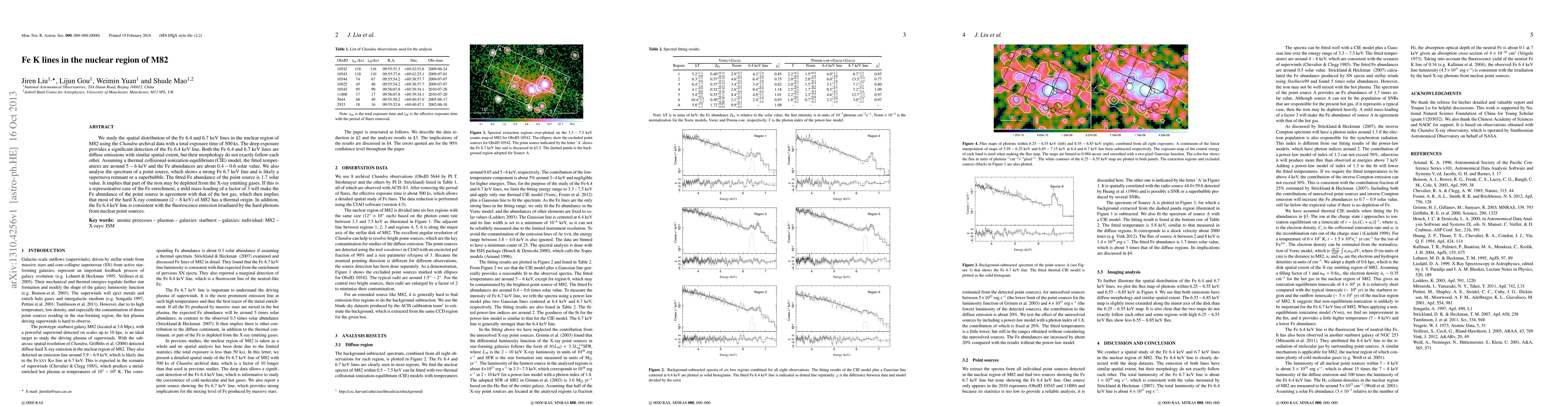 This study uses Chandra data to analyze the Fe K lines in M82's nuclear region, detecting significant Fe 6.4 keV line emissions. The Fe 6.4 and 6.7 keV lines show similar spatial distributions but different morphologies, suggesting partial depletion of iron from X-ray emitting gases.