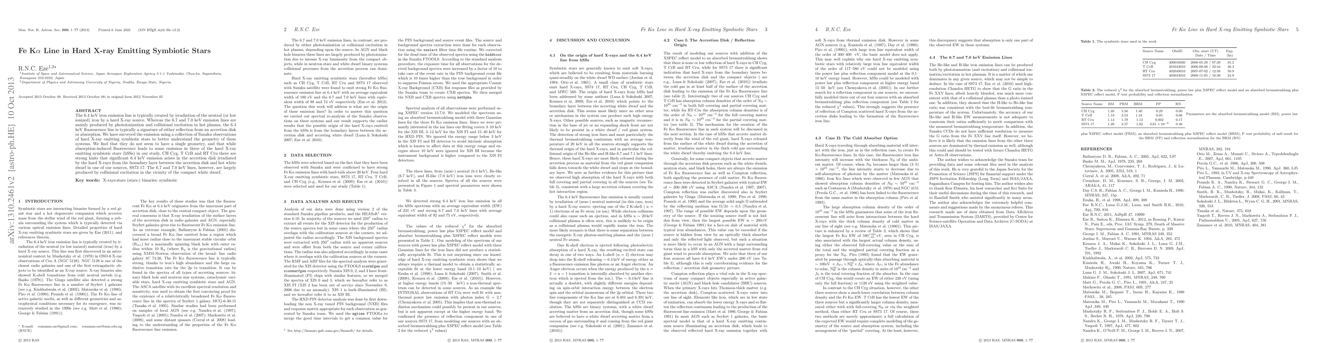 The 6.4 keV iron emission line is typically created by irradiation of the neutral (or low ionized) iron by a hard X-ray source. Whereas the 6.7 and 7.0 keV emission lines are mainly produced by photoionization and collisional excitation in hot plasma, the 6.4 keV fluorescence line is typically a signature of either reflection from an accretion disk or absorption. We have surveyed the emission using a collection of Suzaku ob- servations of hard X-ray emitting symbiotic stars to better understand the geometry of these systems. We find that they do not seem to have a single geometry, and that while absorption-induced fluorescence leads to some emission in three of the hard X-ray emitting symbiotic stars (hSSs) in our study, CH Cyg, T CrB and RT Cru there are strong hints that significant 6.4 keV emission arises in the accretion disk irradiated by the hard X-rays from the boundary layer between the accretion disk and hot white dwarf in one of our sources, SS73 17. The 6.7 and 7.0 keV lines, however, are largely produced by collisional excitation in the vicinity of the compact white dwarf.