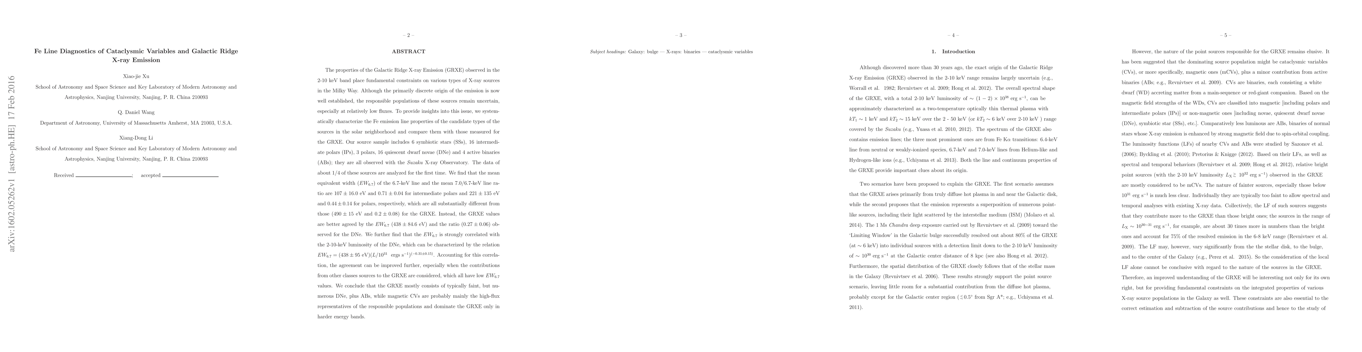 The properties of the Galactic Ridge X-ray Emission (GRXE) observed in the 2-10 keV band place fundamental constraints on various types of X-ray sources in the Milky Way. Although the primarily discrete origin of the emission is now well established, the responsible populations of these sources remain uncertain, especially at relatively low fluxes. To provide insights into this issue, we systematically characterize the Fe emission line properties of the candidate types of the sources in the solar neighborhood and compare them with those measured for the GRXE. Our source sample includes 6 symbiotic stars (SSs), 16 intermediate polars (IPs), 3 polars, 16 quiescent dwarf novae (DNe) and 4 active binaries (ABs). We find that the mean equivalent width ($EW_{6.7}$) of the 6.7-keV line and the mean 7.0/6.7-keV line ratio are $107\pm16.0$ eV and $0.71\pm 0.04$ for intermediate polars and $221\pm 135$ eV and $0.44\pm 0.14$ for polars, respectively, which are all substantially different from those ($490\pm15 $~eV and $0.2\pm 0.08$) for the GRXE. Instead, the GRXE values are better agreed by the $EW_{6.7}$ ($438\pm 84.6$~eV) and the ratio ($0.27\pm 0.06$) observed for the DNe. We further find that the $EW_{6.7}$ is strongly correlated with the 2-10-keV luminosity of the DNe, which can be characterized by the relation $EW_{6.7}=(438\pm95 {\rm~eV}) (L/10^{31}~{\rm~ergs~s^{-1} })^{(-0.31\pm0.15)}$. Accounting for this correlation, the agreement can be improved further, especially when the contributions from other classes sources to the GRXE are considered, which all have low $EW_{6.7}$ values. We conclude that the GRXE mostly consists of typically faint, but numerous DNe, plus ABs, while magnetic CVs are probably mainly the high-flux representatives of the responsible populations and dominate the GRXE only in harder energy bands.