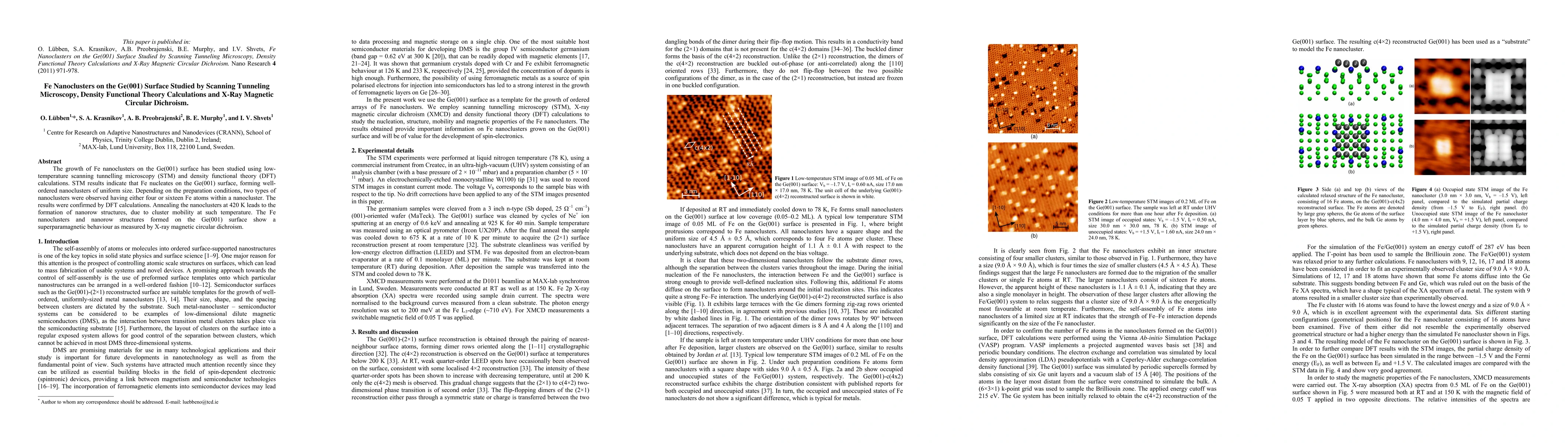 Summary: This study uses scanning tunneling microscopy and density functional theory to investigate Fe nanoclusters on Ge(001) surfaces, revealing distinct nanocluster formations and superparamagnetic behavior confirmed by X-ray magnetic circular dichroism.