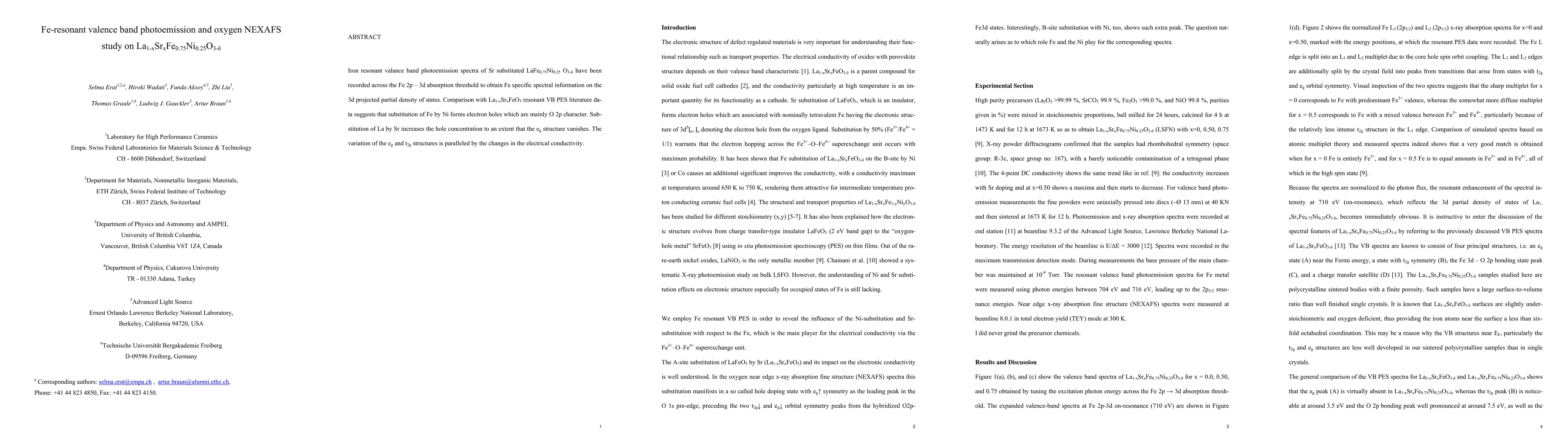 Iron resonant valance band photoemission spectra of Sr substituted LaFe0.75Ni0.25 O3-{\delta} have been recorded across the Fe 2p - 3d absorption threshold to obtain Fe specific spectral information on the 3d projected partial density of states. Comparison with La1-xSrxFeO3 resonant VB PES literature data suggests that substitution of Fe by Ni forms electron holes which are mainly O 2p character. Substitution of La by Sr increases the hole concentration to an extent that the eg structure vanishes. The variation of the eg and t2g structures is paralleled by the changes in the electrical conductivity.