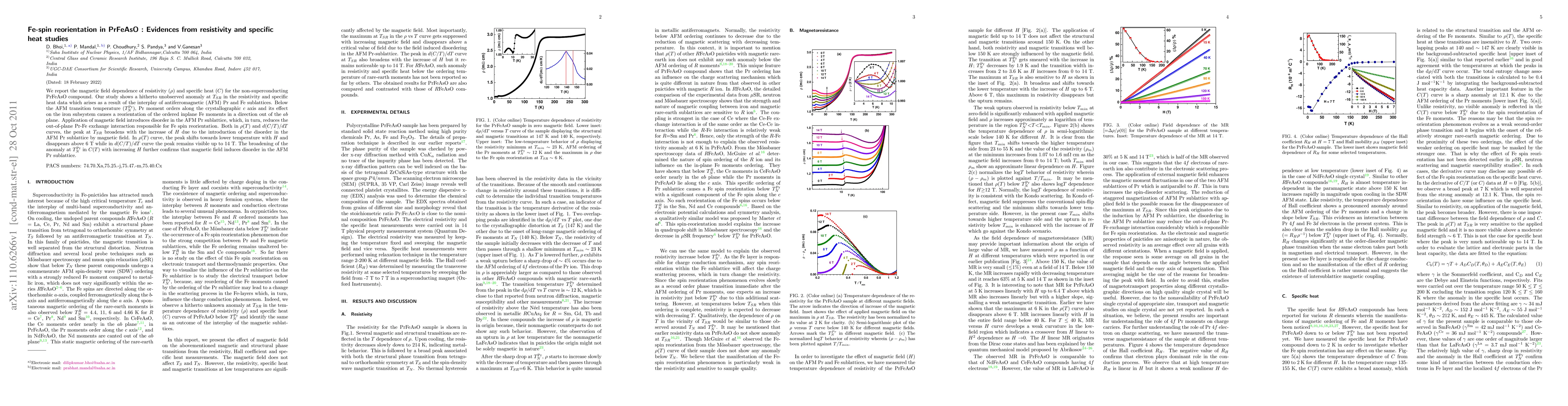This study investigates the magnetic field dependence of resistivity and specific heat in PrFeAsO, revealing an anomaly at $T_{SR}$ due to Fe spin reorientation driven by the AFM Pr sublattice. The peak in resistivity and specific heat broadens with increasing magnetic field, indicating the disorder induced in the AFM Pr sublattice, which disrupts the Fe spin reorientation.