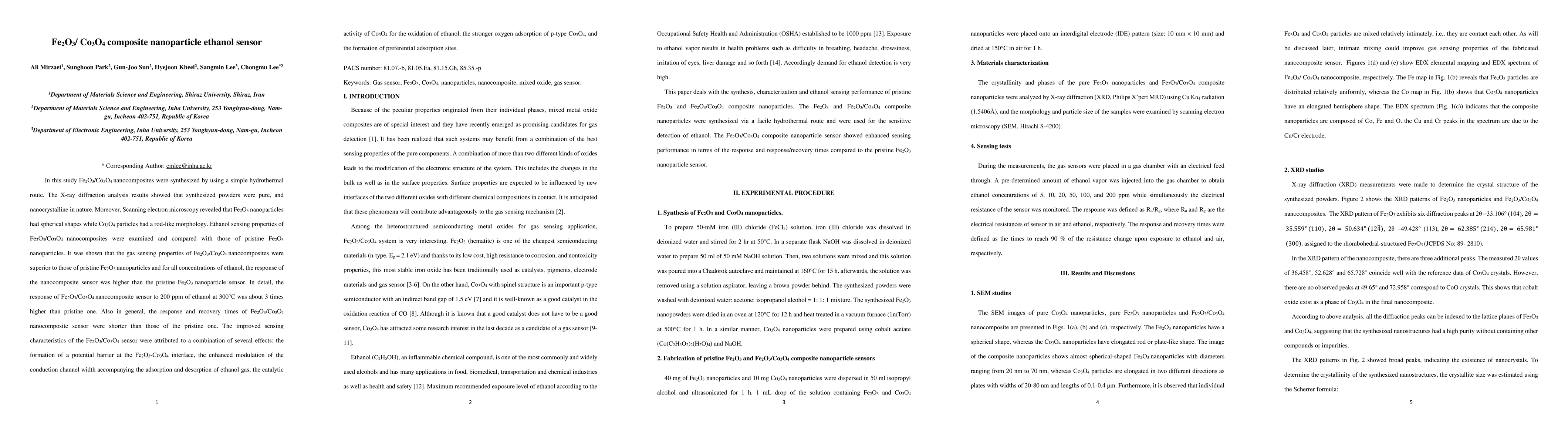Researchers created a composite nanoparticle sensor using Fe2O3 and Co3O4 that showed improved ethanol sensing properties compared to pure Fe2O3 nanoparticles, including faster response and recovery times.