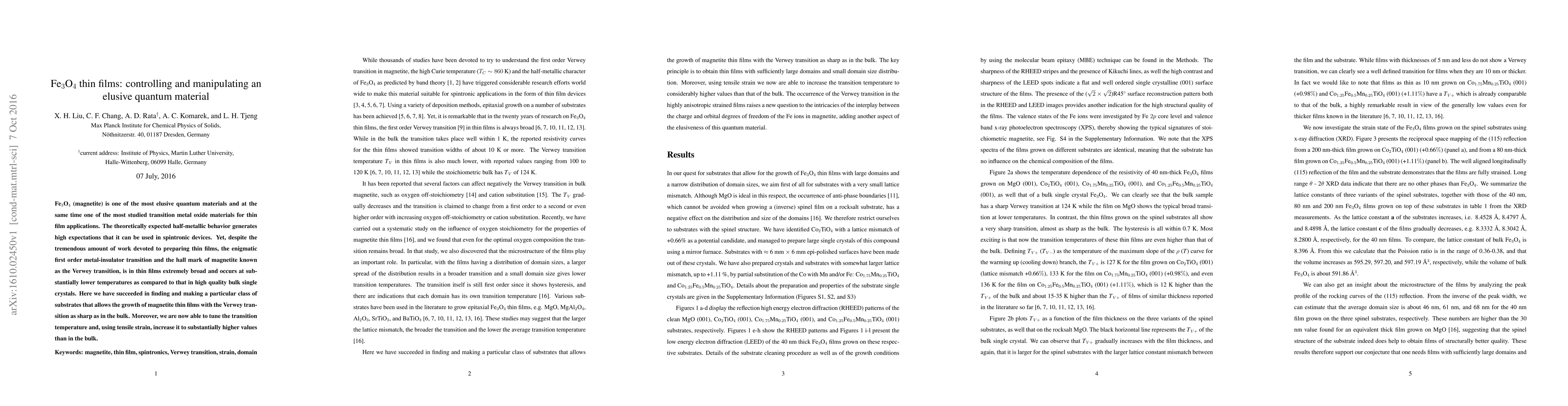 Fe3O4 (magnetite) is one of the most elusive quantum materials and at the same time one of the most studied transition metal oxide materials for thin film applications. The theoretically expected half-metallic behavior generates high expectations that it can be used in spintronic devices. Yet, despite the tremendous amount of work devoted to preparing thin films, the enigmatic first order metal-insulator transition and the hall mark of magnetite known as the Verwey transition, is in thin films extremely broad and occurs at substantially lower temperatures as compared to that in high quality bulk single crystals. Here we have succeeded in finding and making a particular class of substrates that allows the growth of magnetite thin films with the Verwey transition as sharp as in the bulk. Moreover, we are now able to tune the transition temperature and, using tensile strain, increase it to substantially higher values than in the bulk.