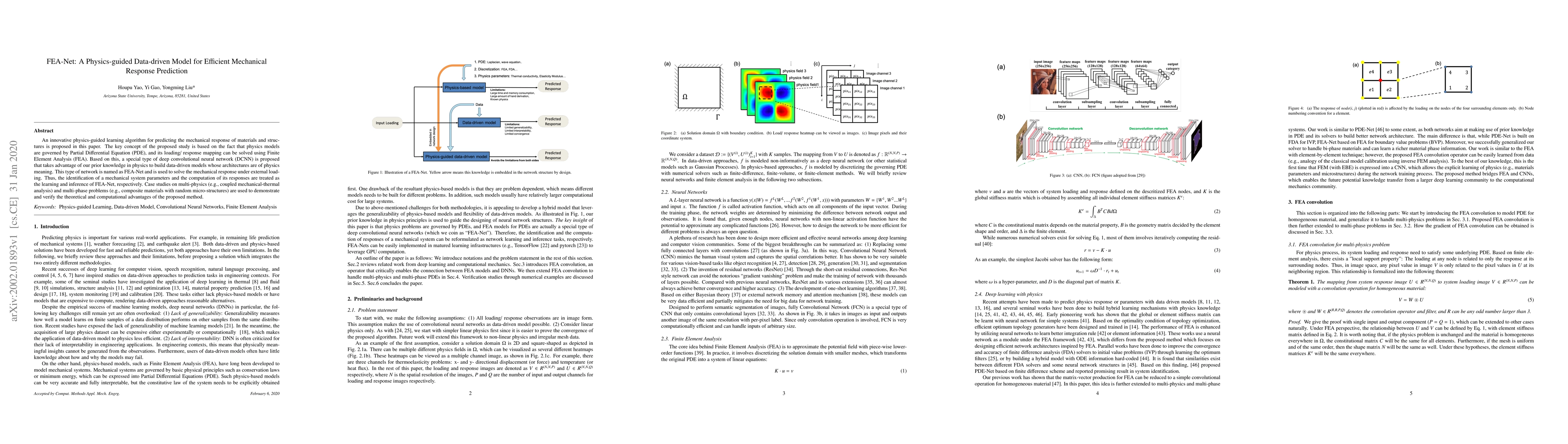 This paper introduces FEA-Net, a physics-guided deep convolutional neural network designed to predict the mechanical response of materials and structures by leveraging Partial Differential Equations and Finite Element Analysis. The method demonstrates advantages in solving multi-physics and multi-phase problems, showcasing its efficiency and accuracy.