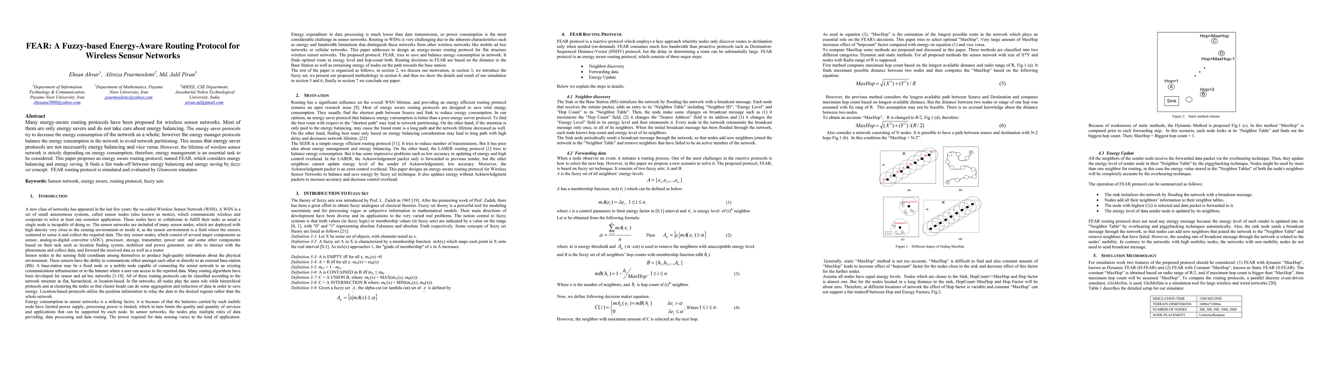 This paper introduces FEAR, a fuzzy-based energy-aware routing protocol for wireless sensor networks that balances energy consumption to enhance network lifetime, using a fair trade-off between energy saving and energy balancing through fuzzy set concepts. The protocol's performance is evaluated using the Glomosim simulator.