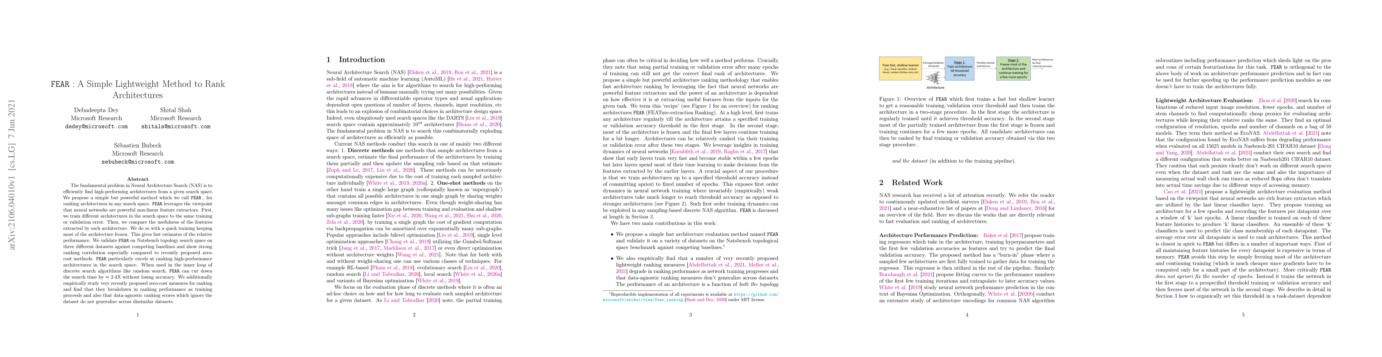 The fundamental problem in Neural Architecture Search (NAS) is to efficiently find high-performing architectures from a given search space. We propose a simple but powerful method which we call FEAR, for ranking architectures in any search space. FEAR leverages the viewpoint that neural networks are powerful non-linear feature extractors. First, we train different architectures in the search space to the same training or validation error. Then, we compare the usefulness of the features extracted by each architecture. We do so with a quick training keeping most of the architecture frozen. This gives fast estimates of the relative performance. We validate FEAR on Natsbench topology search space on three different datasets against competing baselines and show strong ranking correlation especially compared to recently proposed zero-cost methods. FEAR particularly excels at ranking high-performance architectures in the search space. When used in the inner loop of discrete search algorithms like random search, FEAR can cut down the search time by approximately 2.4X without losing accuracy. We additionally empirically study very recently proposed zero-cost measures for ranking and find that they breakdown in ranking performance as training proceeds and also that data-agnostic ranking scores which ignore the dataset do not generalize across dissimilar datasets.