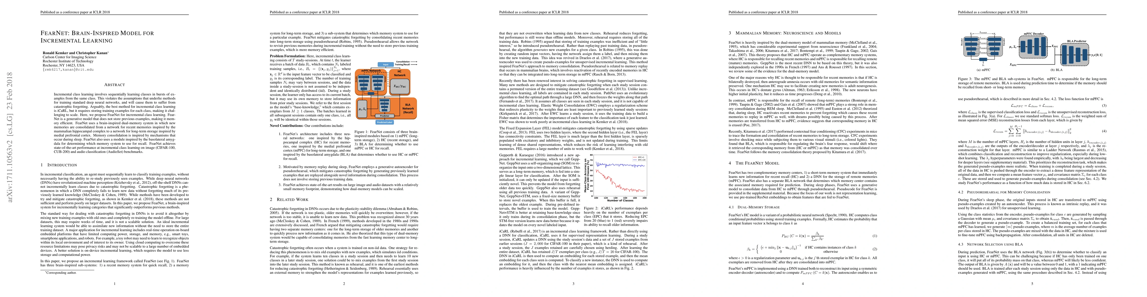 FearNet is a brain-inspired generative model for incremental class learning that avoids catastrophic forgetting by using a dual-memory system for memory consolidation, achieving state-of-the-art performance on image and audio classification benchmarks without storing previous examples.