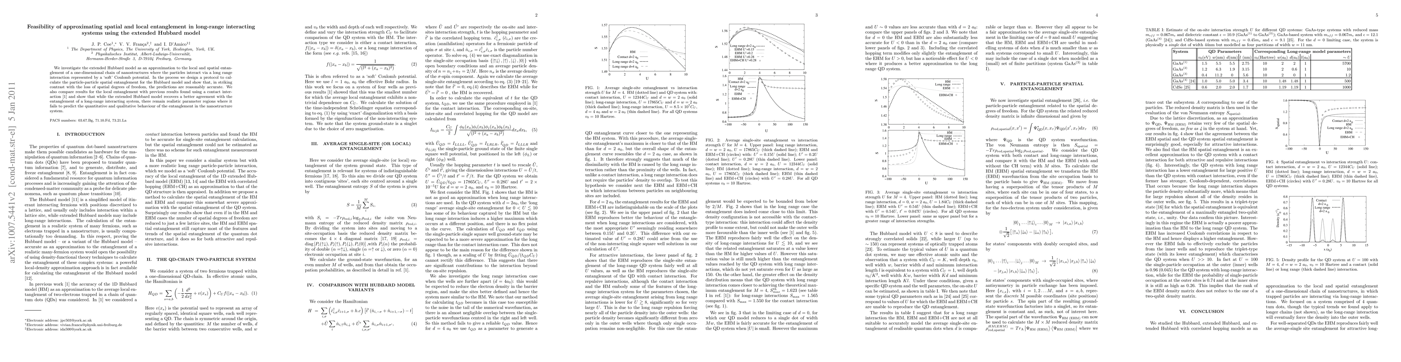 We investigate the extended Hubbard model as an approximation to the local and spatial entanglement of a one-dimensional chain of nanostructures where the particles interact via a long range interaction represented by a `soft' Coulomb potential. In the process we design a protocol to calculate the particle-particle spatial entanglement for the Hubbard model and show that, in striking contrast with the loss of spatial degrees of freedom, the predictions are reasonably accurate. We also compare results for the local entanglement with previous results found using a contact interaction (PRA, 81 (2010) 052321) and show that while the extended Hubbard model recovers a better agreement with the entanglement of a long-range interacting system, there remain realistic parameter regions where it fails to predict the quantitative and qualitative behaviour of the entanglement in the nanostructure system.