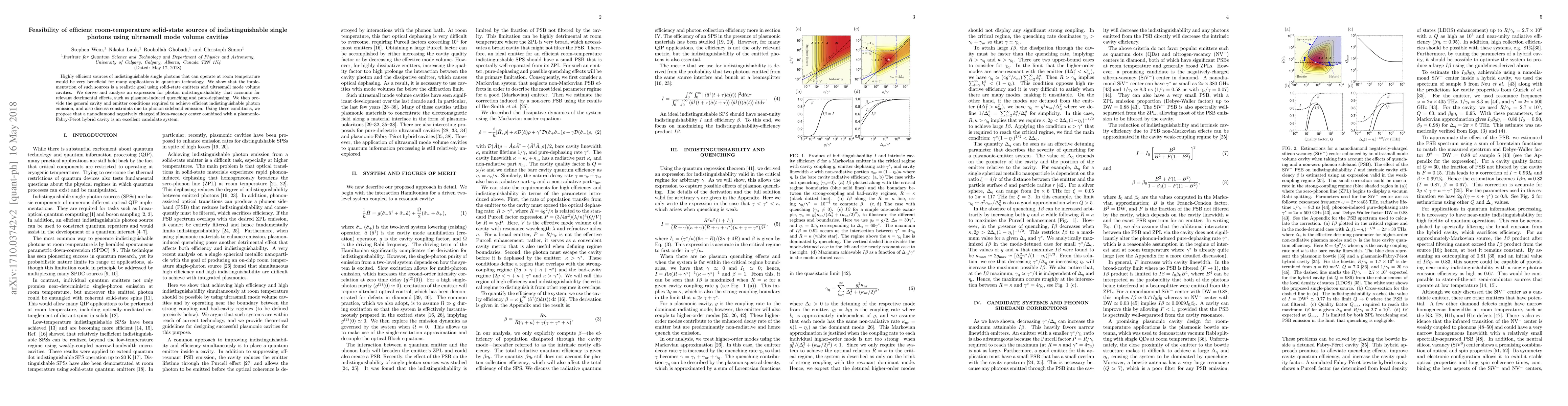 This paper demonstrates the feasibility of creating efficient room-temperature solid-state sources of indistinguishable single photons using ultrasmall mode volume cavities. It proposes a nanodiamond with a silicon-vacancy center and a plasmonic-Fabry-Perot hybrid cavity as a promising candidate system, addressing challenges like plasmon-induced quenching and phonon sideband emission.