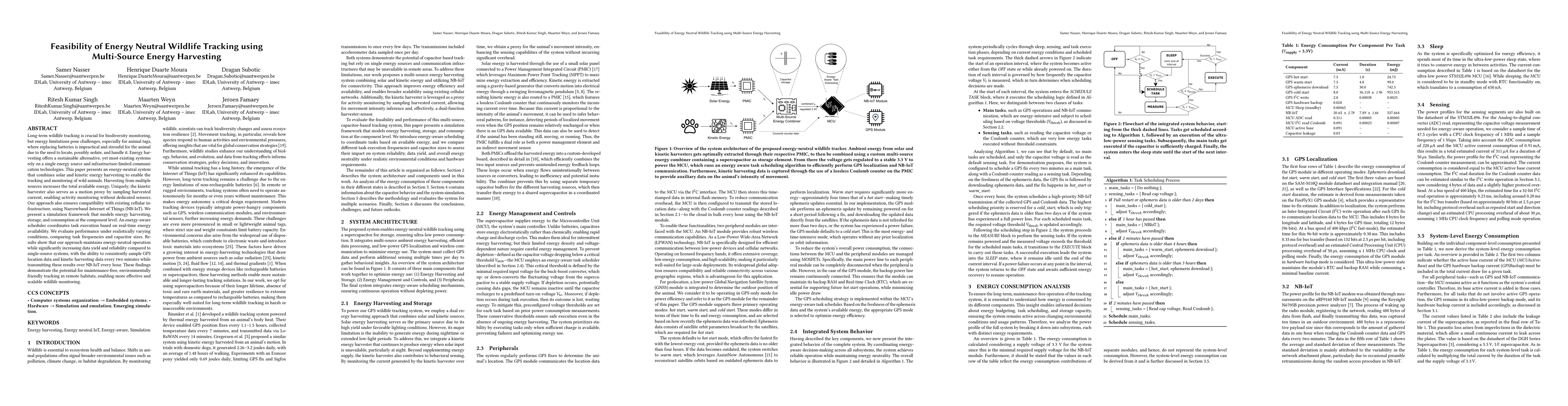 Long-term wildlife tracking is crucial for biodiversity monitoring, but energy limitations pose challenges, especially for animal tags, where replacing batteries is impractical and stressful for the animal due to the need to locate, possibly sedate, and handle it. Energy harvesting offers a sustainable alternative, yet most existing systems rely on a single energy source and infrastructure-limited communication technologies. This paper presents an energy-neutral system that combines solar and kinetic energy harvesting to enable the tracking and monitoring of wild animals. Harvesting from multiple sources increases the total available energy. Uniquely, the kinetic harvester also serves as a motion proxy by sampling harvested current, enabling activity monitoring without dedicated sensors. Our approach also ensures compatibility with existing cellular infrastructure, using Narrowband Internet of Things (NB-IoT). We present a simulation framework that models energy harvesting, storage, and consumption at the component level. An energy-aware scheduler coordinates task execution based on real-time energy availability. We evaluate performance under realistically varying conditions, comparing task frequencies and capacitor sizes. Results show that our approach maintains energy-neutral operation while significantly increasing data yield and reliability compared to single-source systems, with the ability to consistently sample GPS location data and kinetic harvesting data every two minutes while transmitting these results over NB-IoT every hour. These findings demonstrate the potential for maintenance-free, environmentally friendly tracking in remote habitats, enabling more effective and scalable wildlife monitoring.