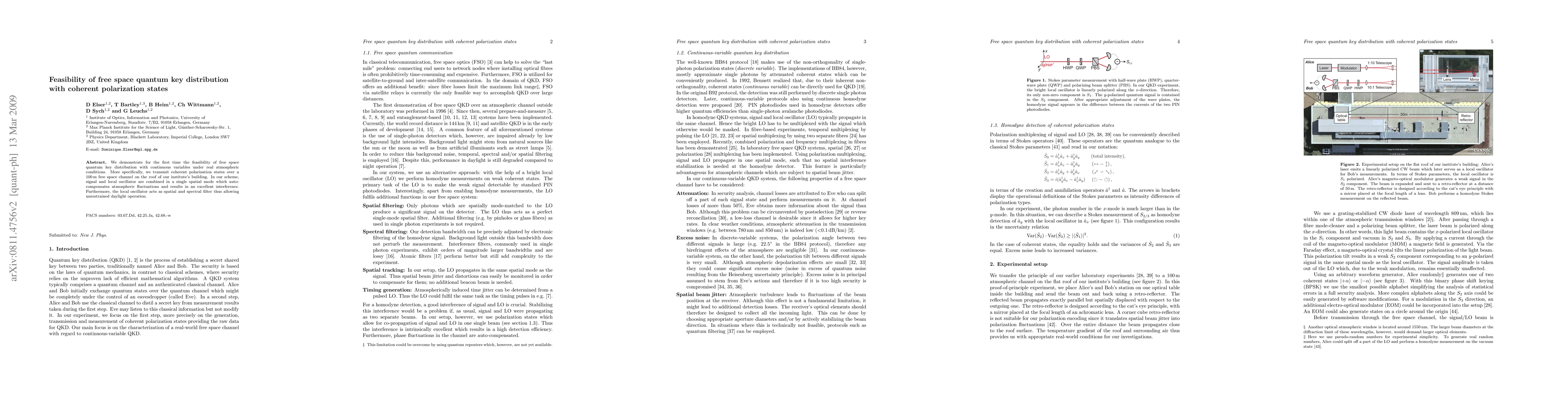 This paper demonstrates the feasibility of free space quantum key distribution using continuous variables and coherent polarization over a 100m channel, achieving excellent interference and daylight operation by combining signal and local oscillator in a single spatial mode.