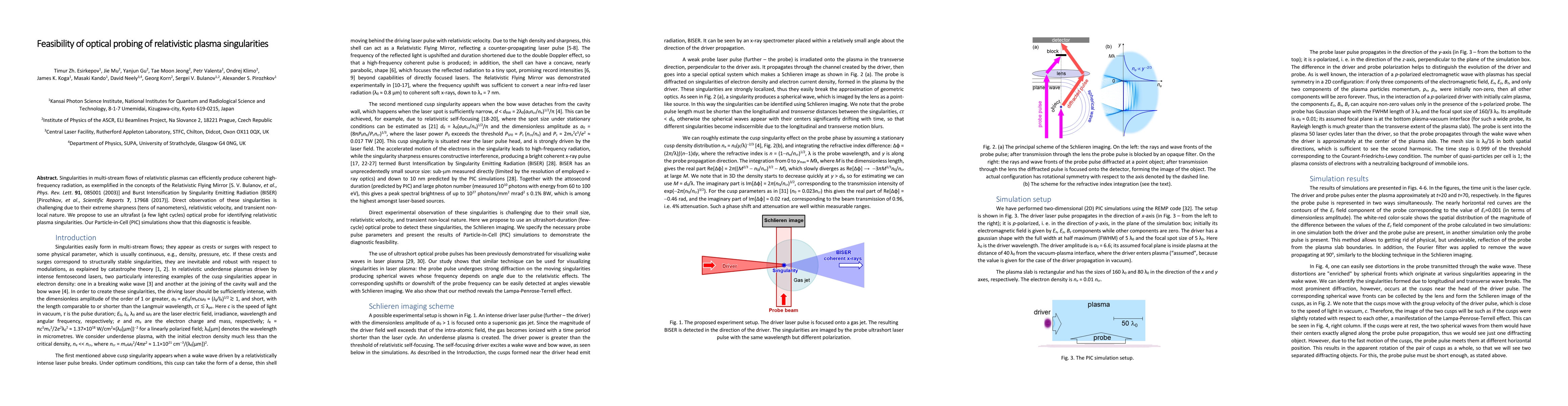 Singularities in multi-stream flows of relativistic plasmas can efficiently produce coherent high-frequency radiation, as exemplified in the concepts of Relativistic Flying Mirror [S. V. Bulanov, et al., Phys. Rev. Lett. 91, 085001 (2003)] and Burst Intensification by Singularity Emitting Radiation (BISER) [Pirozhkov, et al., Scientific Reports 7, 17968 (2017)]. Direct observation of these singularities is challenging due to their extreme sharpness (tens of nanometers), relativistic velocity, and transient non-local nature. We propose to use ultrafast (a few light cycles) optical probe for identifying relativistic plasma singularities. Our Particle-in-Cell (PIC) simulations show that this diagnostic is feasible.