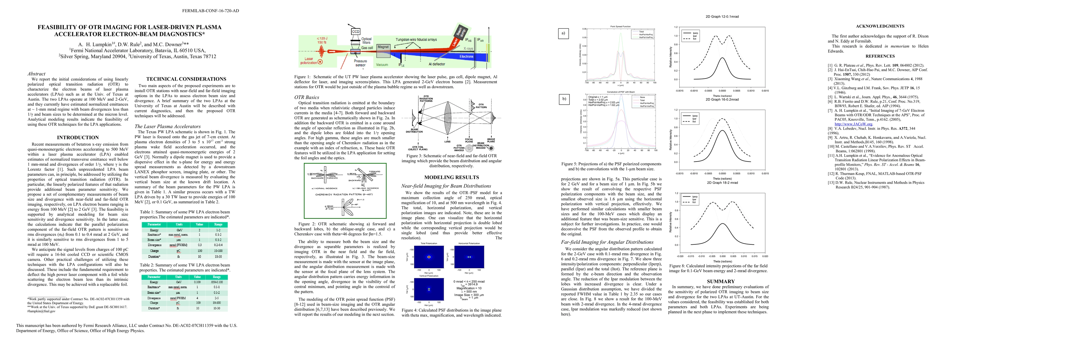 The research considers the use of linearly polarized optical transition radiation (OTR) to characterize electron beams in laser plasma accelerators (LPAs) at the University of Texas at Austin, operating at 100 MeV and 2 GeV. Analytical modeling supports the feasibility of OTR techniques for beam size and divergence measurements.