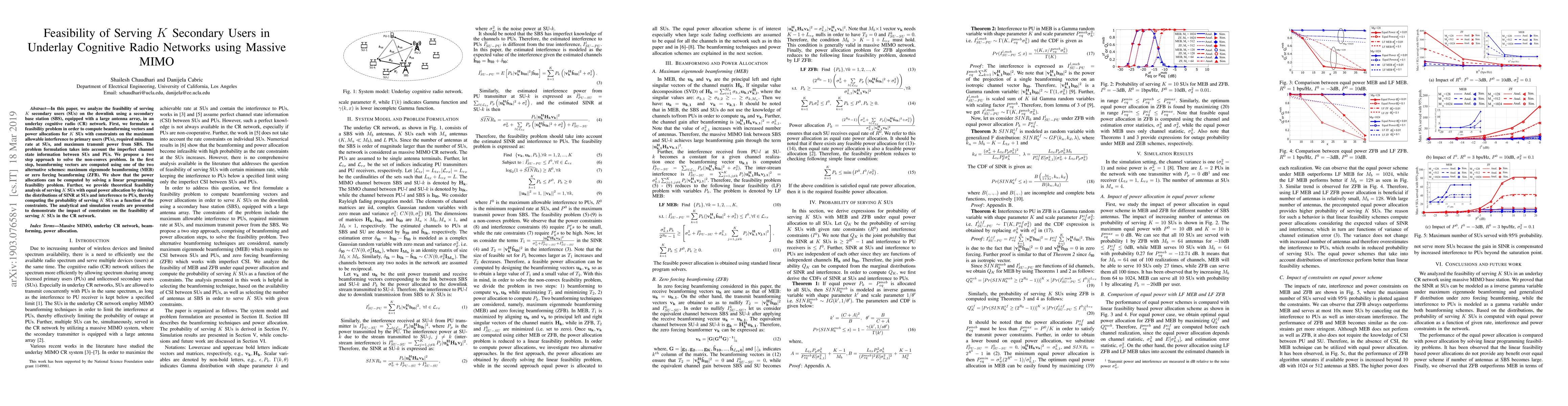 This paper investigates the feasibility of using massive MIMO at a secondary base station to serve K secondary users in an underlay cognitive radio network, formulating a problem to compute beamforming vectors and power allocations while considering constraints on interference to primary users and minimum rates for secondary users. A two-step approach is proposed to solve the non-convex problem, and theoretical analysis is provided to determine the probability of successfully serving K secondary users.