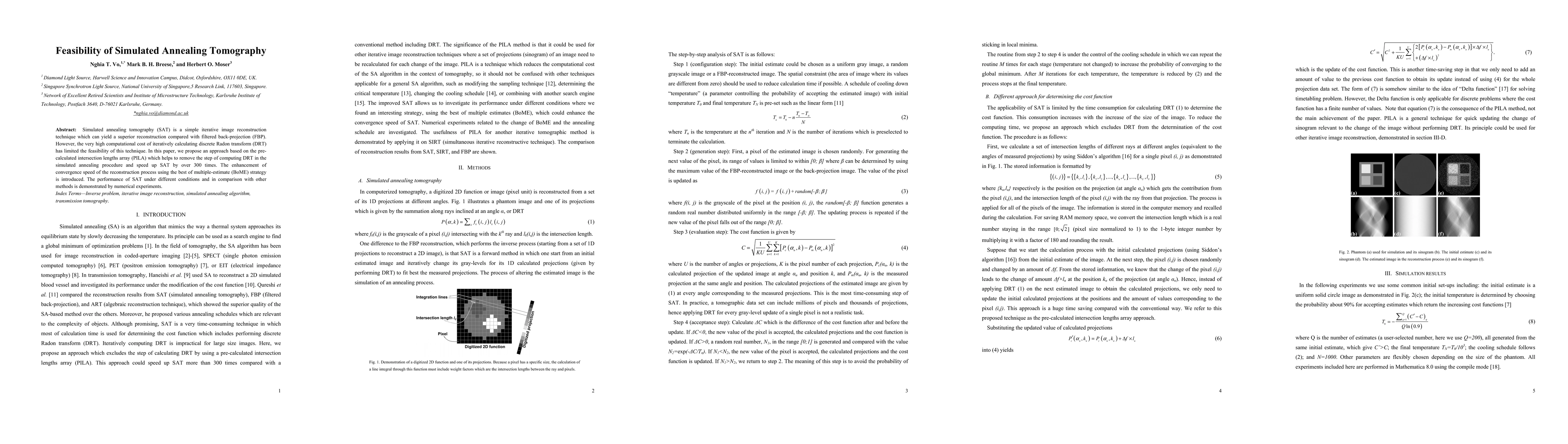 This paper proposes a method to significantly speed up simulated annealing tomography (SAT) by using a pre-calculated intersection lengths array (PILA) to bypass the computationally expensive discrete Radon transform (DRT) calculations. The best of multiple-estimate (BoME) strategy further enhances convergence speed, and numerical experiments demonstrate improved performance compared to other reconstruction techniques.