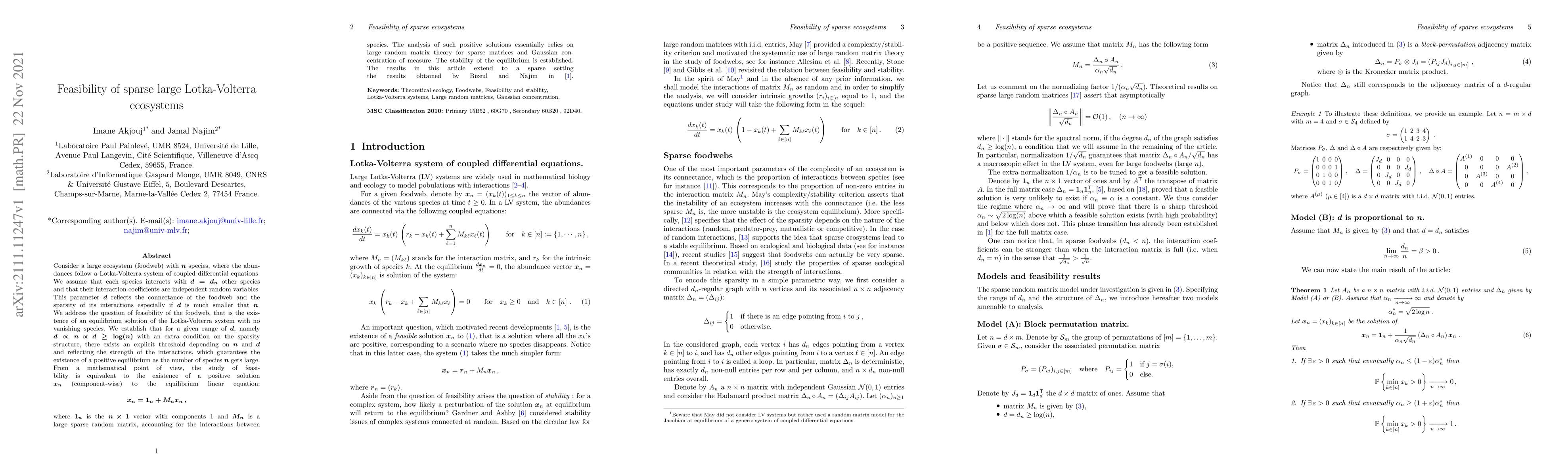 A study examines the feasibility of sparse large Lotka-Volterra ecosystems, finding that a positive equilibrium solution exists for a given range of interactions with an explicit threshold depending on species number and interaction strength.