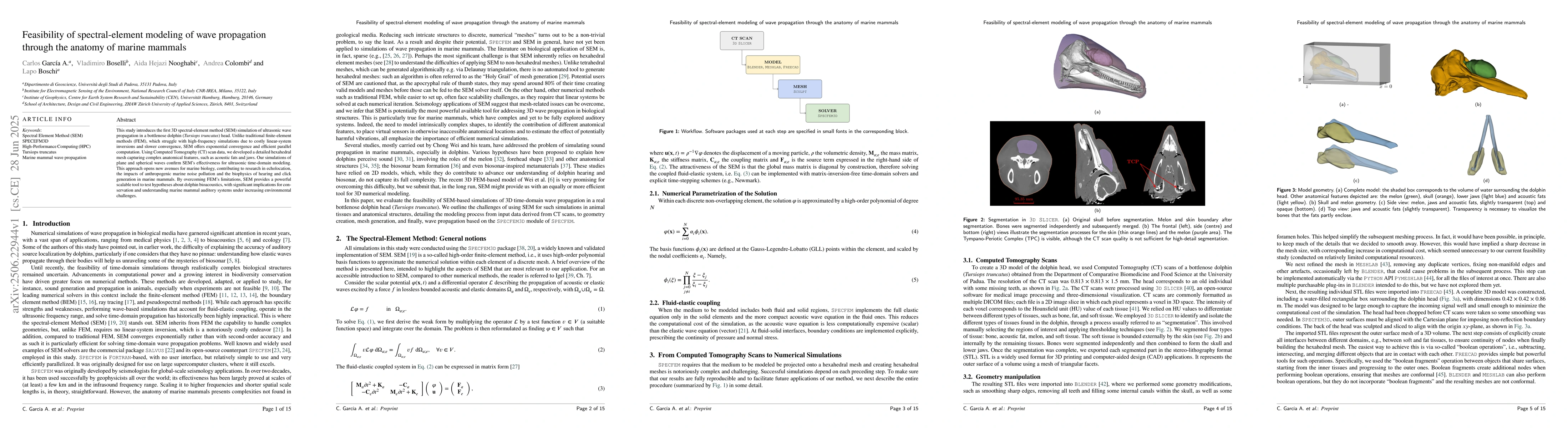This study introduces the first 3D spectral-element method (SEM) simulation of ultrasonic wave propagation in a bottlenose dolphin (Tursiops truncatus) head. Unlike traditional finite-element methods (FEM), which struggle with high-frequency simulations due to costly linear-system inversions and slower convergence, SEM offers exponential convergence and efficient parallel computation. Using Computed Tomography (CT) scan data, we developed a detailed hexahedral mesh capturing complex anatomical features, such as acoustic fats and jaws. Our simulations of plane and spherical waves confirm SEM's effectiveness for ultrasonic time-domain modeling. This approach opens new avenues for marine biology, contributing to research in echolocation, the impacts of anthropogenic marine noise pollution and the biophysics of hearing and click generation in marine mammals. By overcoming FEM's limitations, SEM provides a powerful scalable tool to test hypotheses about dolphin bioacoustics, with significant implications for conservation and understanding marine mammal auditory systems under increasing environmental challenges.