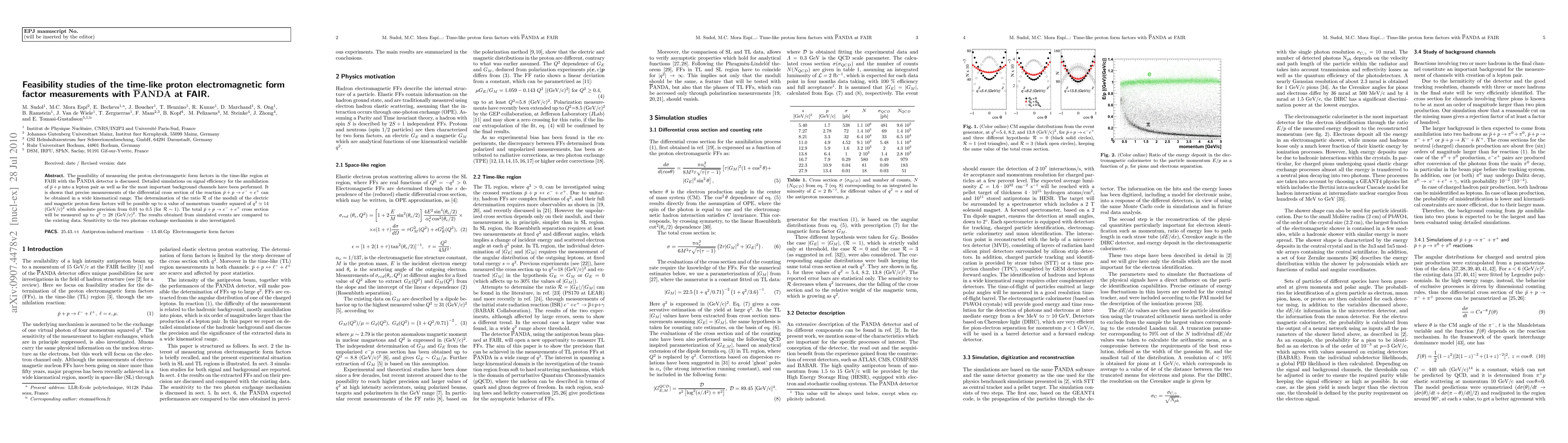 This paper explores the feasibility of measuring the proton electromagnetic form factors in the time-like region using the PANDA detector at FAIR. Simulations indicate precise measurements of the differential cross section for $\bar p +p \to e^++ e^-$, enabling the determination of the electric and magnetic proton form factors up to $q^2\simeq 14$ (GeV/c)$^2$.